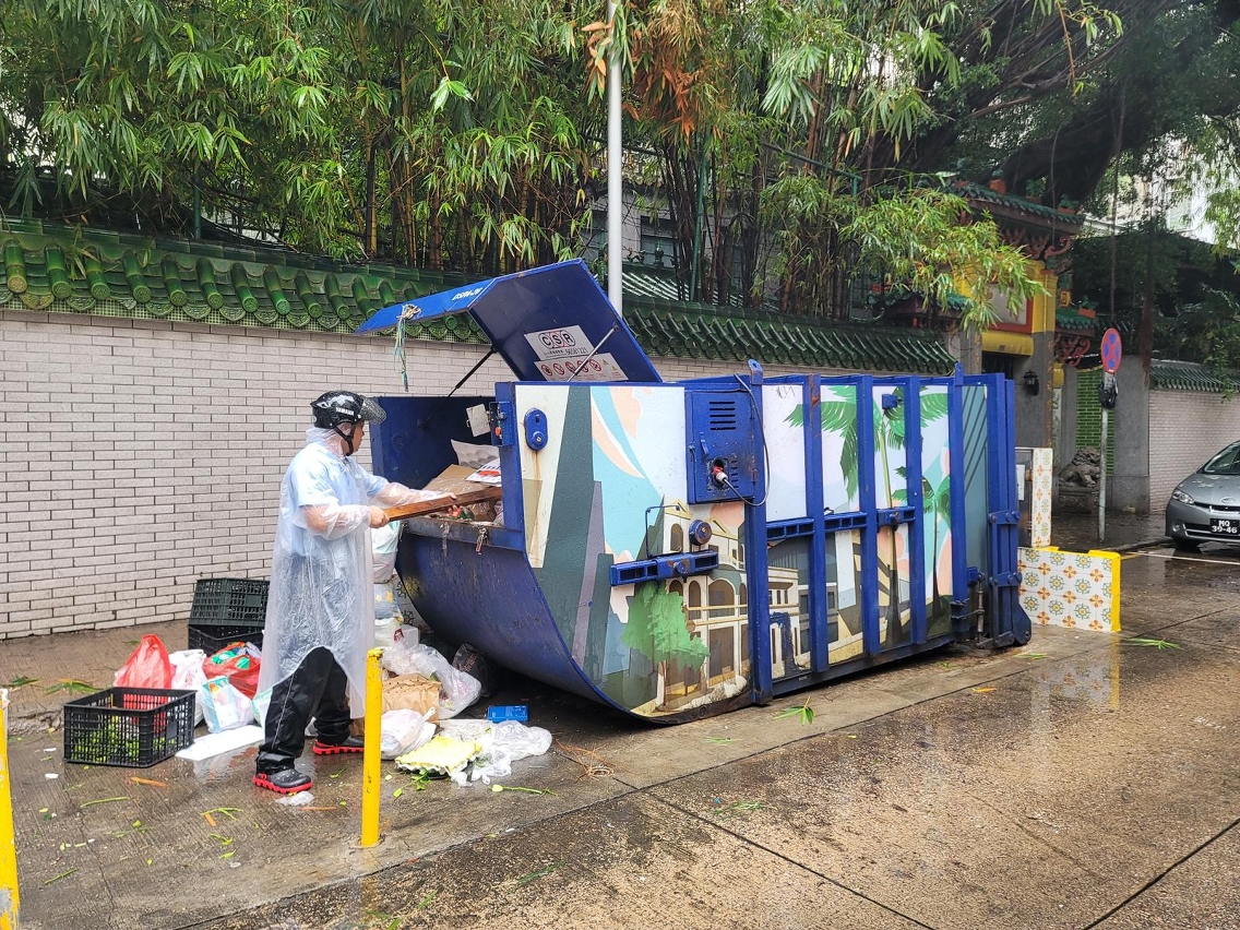 • 颱風期間,工作人員巡查垃圾收集設施,處理垃圾堆積情況