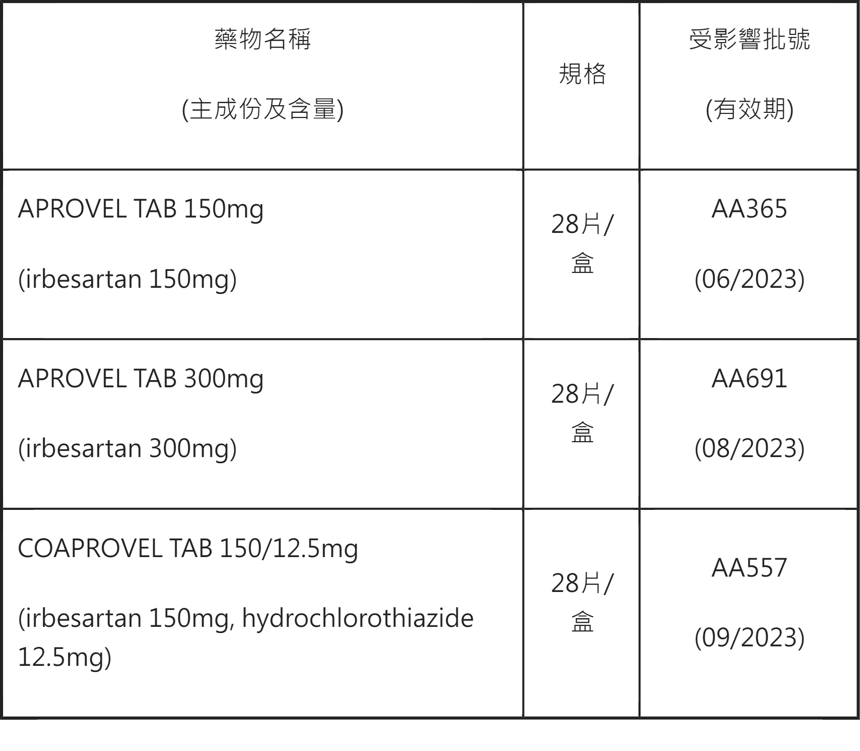 上述三個受影響批次的藥物曾供應予本澳社區藥房、私家醫院及私家診所,其中APROVEL TAB 150mg及APROVEL TAB 300mg屬衛生局的協議藥物。為保障公眾健康,衛生局已要求有關藥物產品的出入口及批發商號、社區藥房、私家醫院及私家診所回收上述批次藥物。居民如在社區藥房獲調配上述批次藥物,可帶同藥物前往相關藥房向藥劑師查詢,以獲安排處理。居民如在私家醫院或私家診所取得上述批次藥物,可諮詢醫院藥劑科或診所主診醫生的意見,以獲適當處理,居民不應自行停藥。如有疑問,可於辦公時間致電85983441向衛生局藥物事務廳查詢。