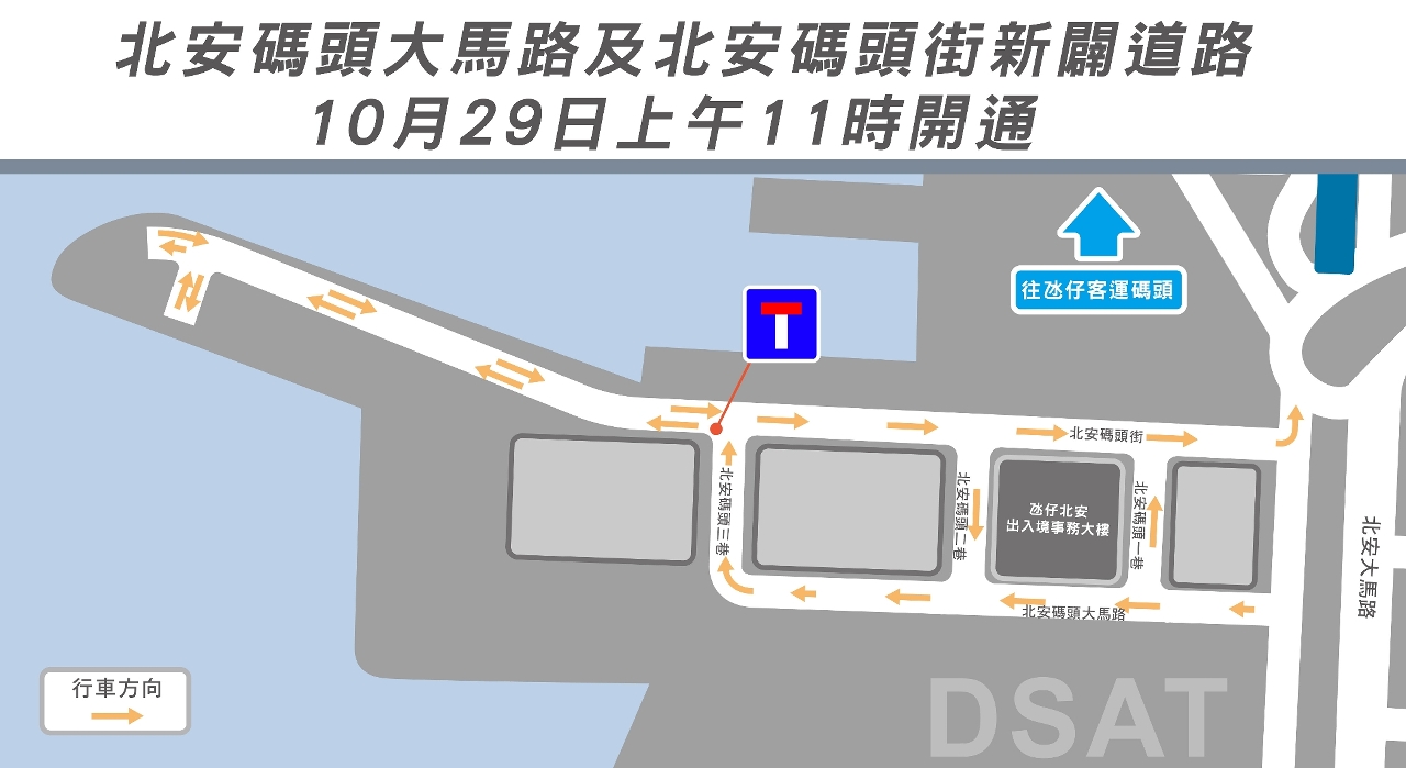 因應氹仔北安出入境事務大樓周邊道路工程竣工,交通事務局今(29日)上午11時開通位於北安碼頭大馬路及北安碼頭街之新闢道路,相關行車安排見附表。