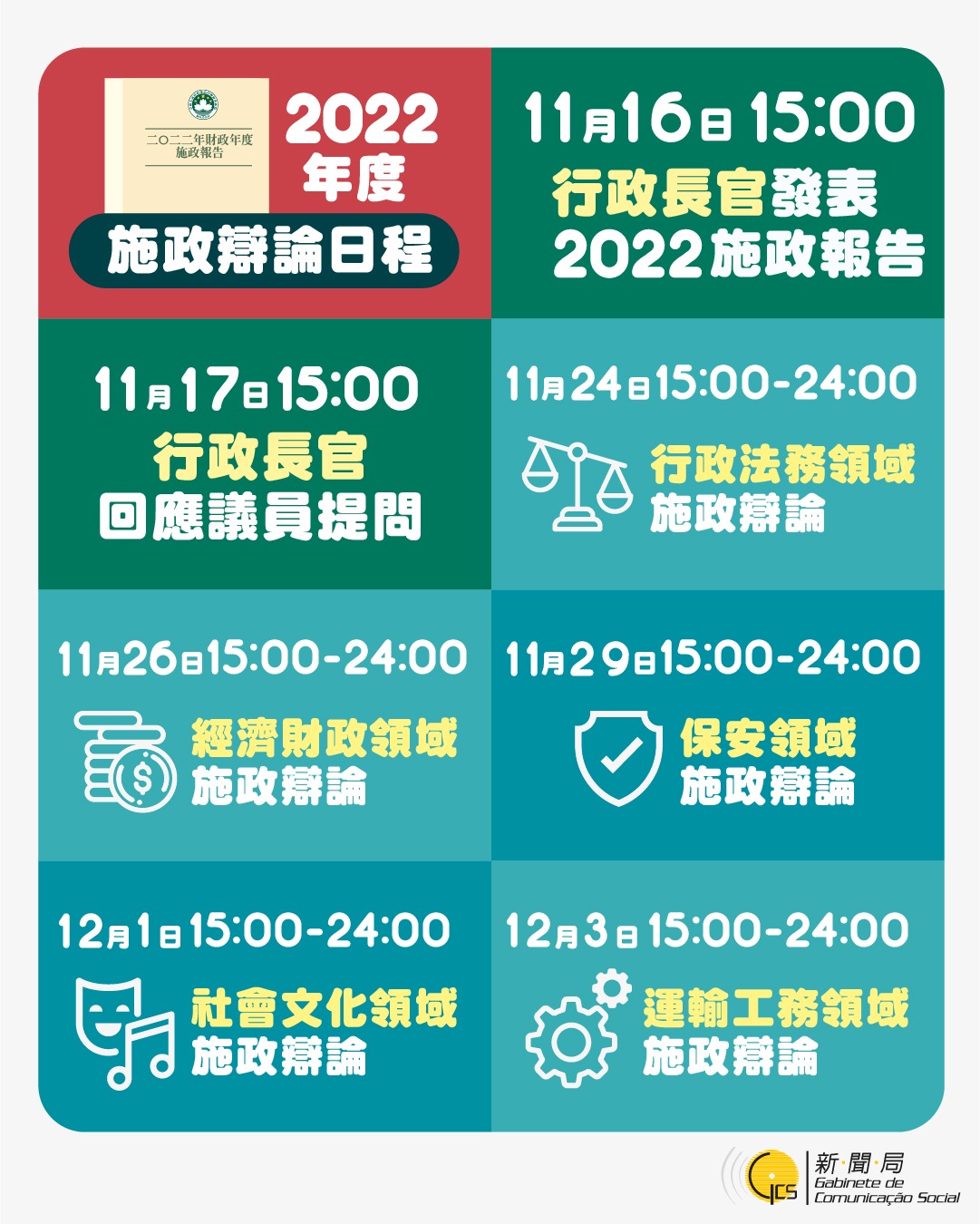 行政長官賀一誠將於11月16日下午3時在立法會發表《2022年財政年度施政報告》,並於同日下午5時在政府總部舉行新聞發佈會,就施政報告內容回答記者提問。行政長官於翌(17)日下午3時列席立法會全體會議,回應議員關於2022年度施政報告的提問。