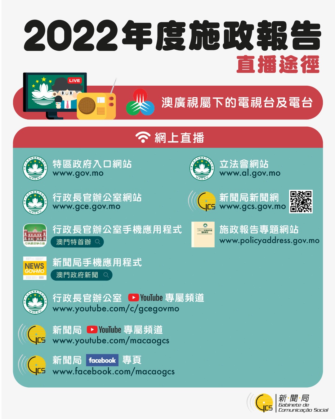 澳廣視屬下電視台及電台屆時將會現場直播。公眾亦可透過澳門特別行政區政府入口網站、行政長官辦公室、立法會和新聞局的網站,行政長官辦公室和新聞局的手機應用程式及專屬Youtube頻道,以及新聞局Facebook專頁,觀看網上直播。