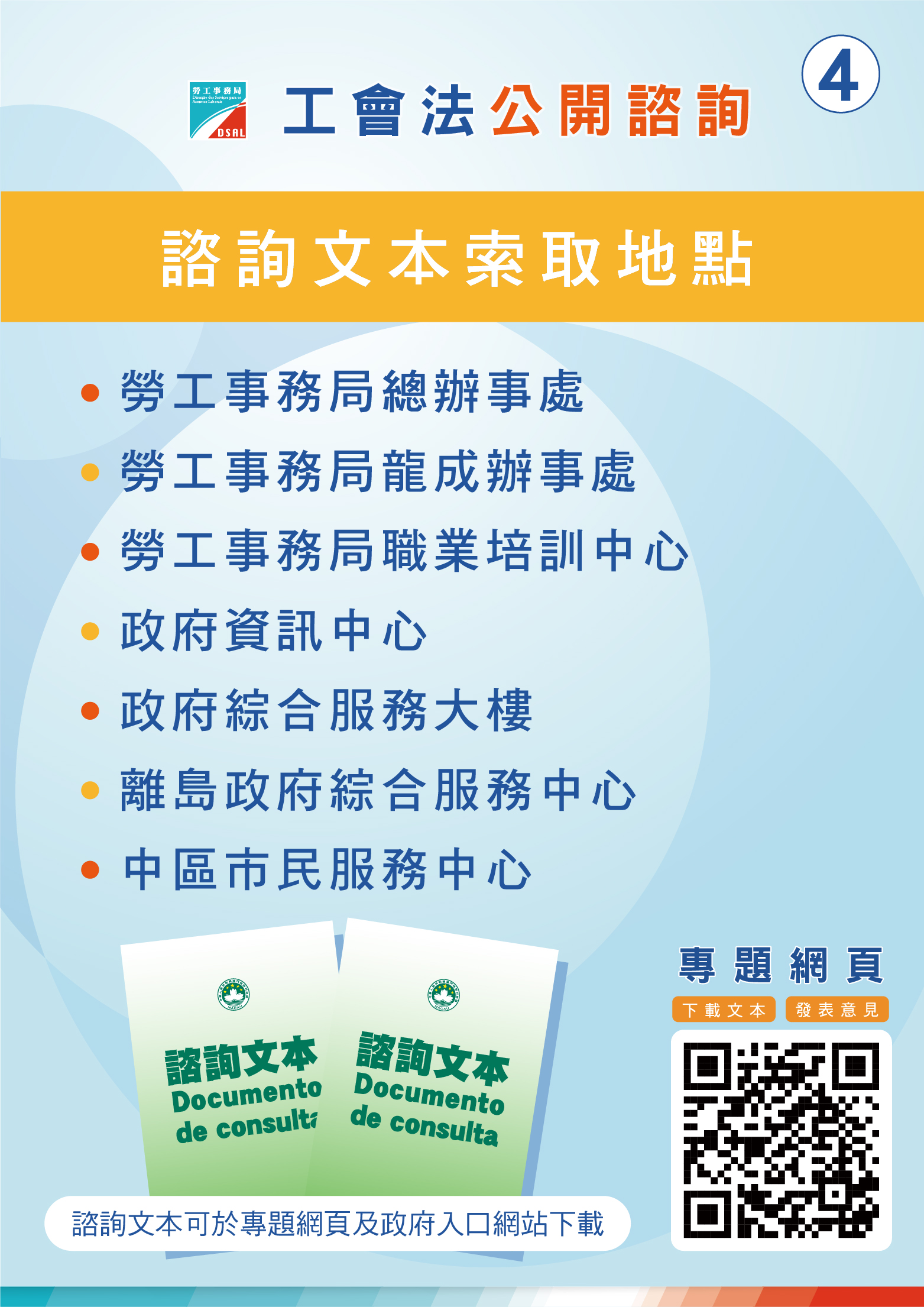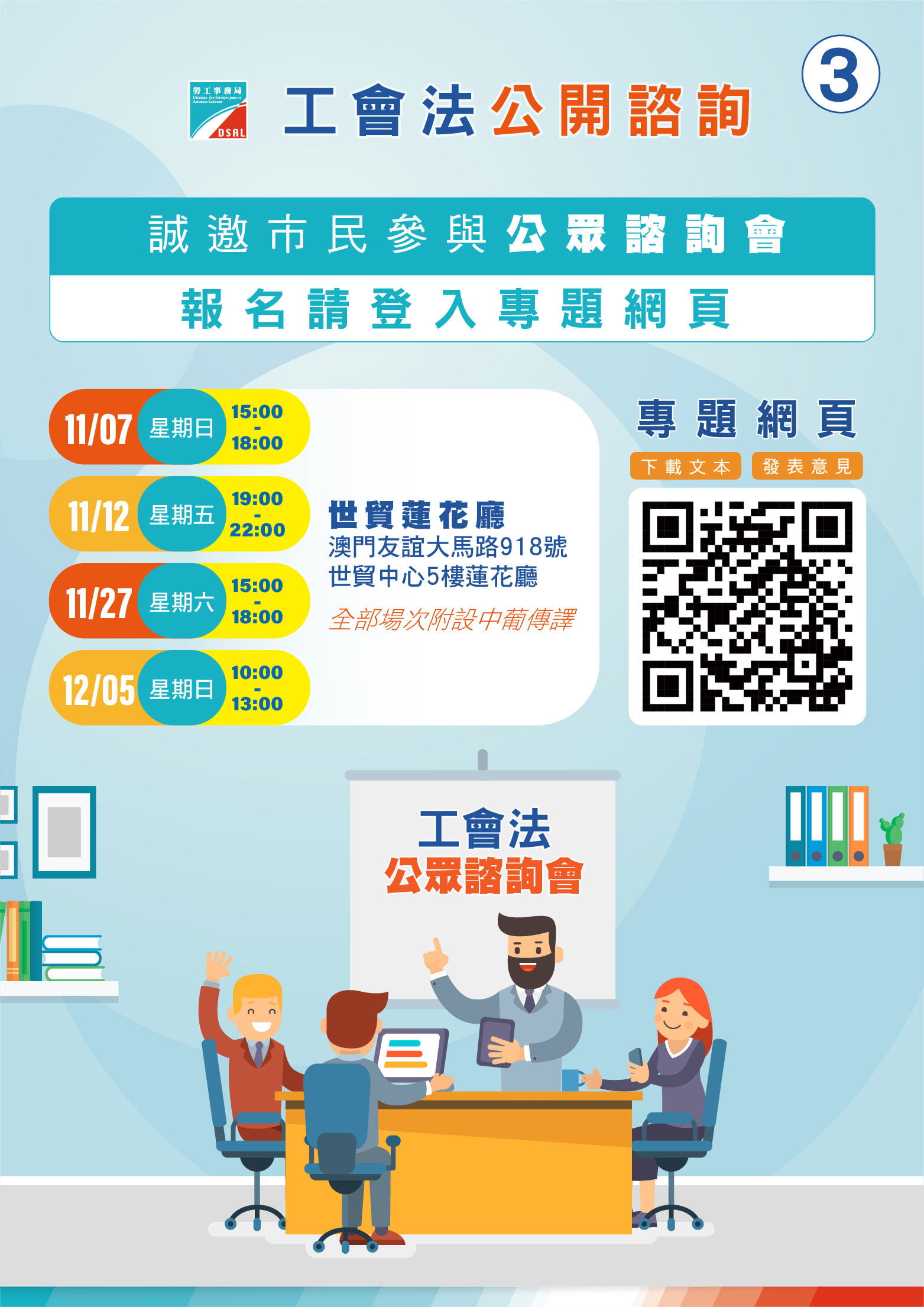 為聽取社會各界對“工會法"諮詢文本的意見及建議,勞工事務局將於諮詢期內,於澳門友誼大馬路918號世貿中心五樓蓮花廳舉辦4場公眾諮詢會。諮詢會以中文為主,並備有中葡傳譯服務。諮詢會具體場次及安排如下︰
