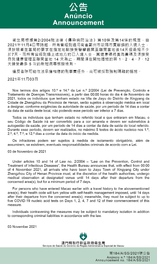 新型冠狀病毒感染應變協調中心(下稱“應變協調中心”)宣佈,因應河南省的疫情變化,衛生局根據第2/2004號法律《傳染病防治法》第10條和第14條的規定,自2021年11月4日零時起,所有曾經到過河南省鄭州市滎陽市賈峪鎮的入境人士,須按照衛生當局的要求在指定地點接受醫學觀察至離開當地後14天但最短不少於7天。而所有曾經到過上述地方的已入境人士,其健康碼將變為黃碼及須接受自我健康管理至離開當地 14 天為止,期間須在開始措施的第 1、2、4、7、12 天接受最多 5 次的新冠病毒核酸檢測。免費核酸檢測預約連結為https://app.ssm.gov.mo/mandatoryrnatestbook。核酸檢測結果不會上載至澳門健康碼亦不可作為出入境用途。如需將核酸檢測結果在澳門健康碼顯示,則須自費檢測。
