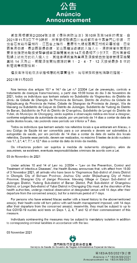新型冠狀病毒感染應變協調中心(下稱“應變協調中心”)宣佈,因應四川省、河北省、江西省和重慶市的疫情變化,衛生局根據第2/2004號法律《傳染病防治法》第10條和第14條的規定,自2021年11月3日下午3時起,所有曾經到過四川省成都市金牛區營門口街道,河北省石家莊市晉州市,江西省上饒市,重慶市九龍坡區馬王村或彩雲街道、巴南區魚洞街道、長壽區菩提街道、渝北區龍溪街道的入境人士,須按照衛生當局的要求在指定地點接受醫學觀察至離開當地後14天但最短不少於7天。而所有曾經到過上述地方的已入境人士,其健康碼將變為黃碼及須接受自我健康管理至離開當地 14 天為止,期間須在開始措施的第 1、2、4、7、12 天接受最多 5 次的新冠病毒核酸檢測。免費核酸檢測預約連結為 https://app.ssm.gov.mo/mandatoryrnatestbook 。核酸檢測結果不會上載至澳門健康碼亦不可作為出入境用途。如需將核酸檢測結果在澳門健康碼顯示,則須自費檢測。
