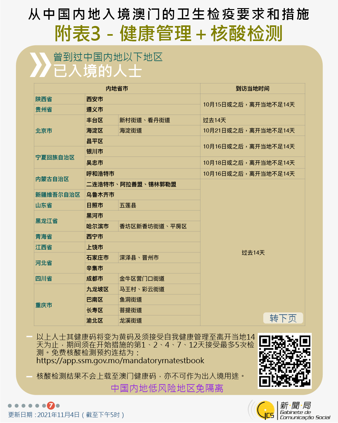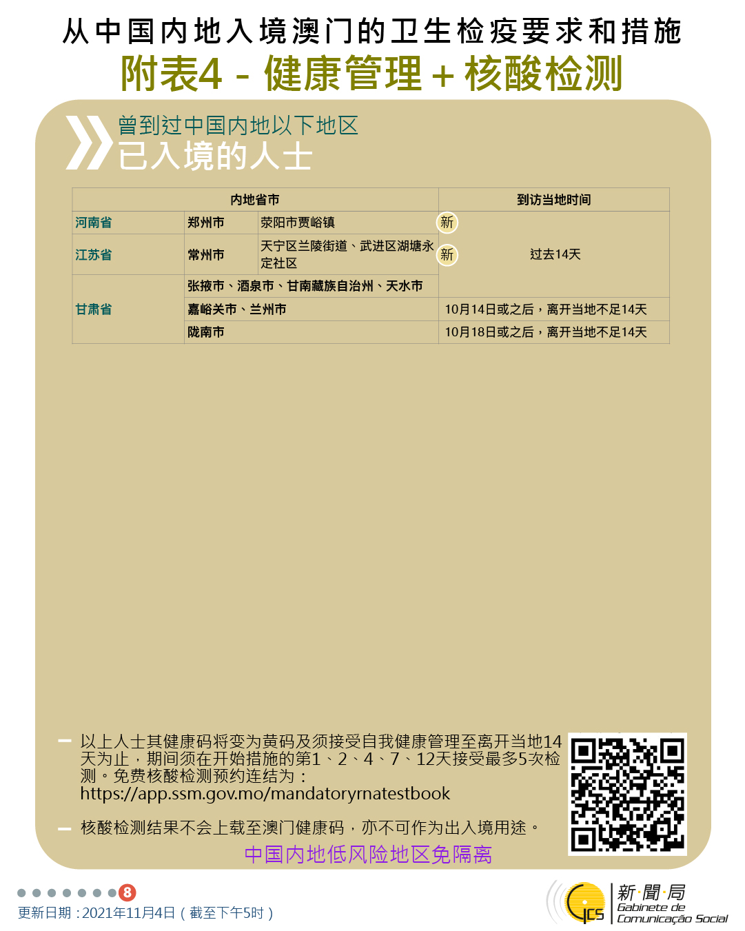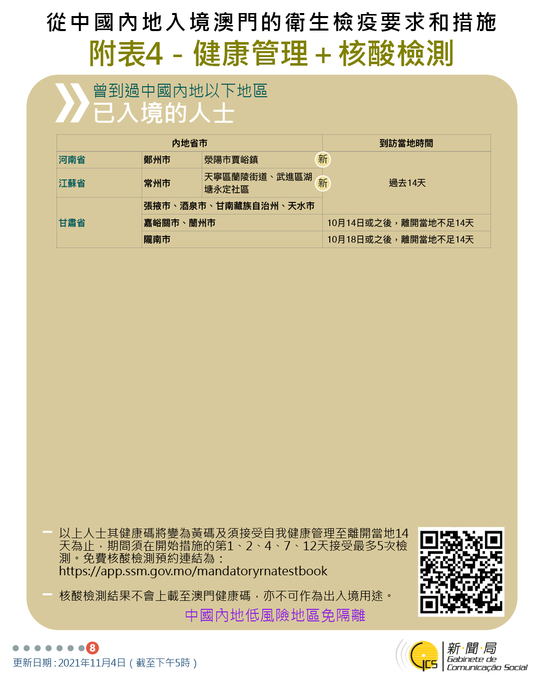 11月4日晚9時起曾到四川省和重慶市相關區域人士的防疫措施