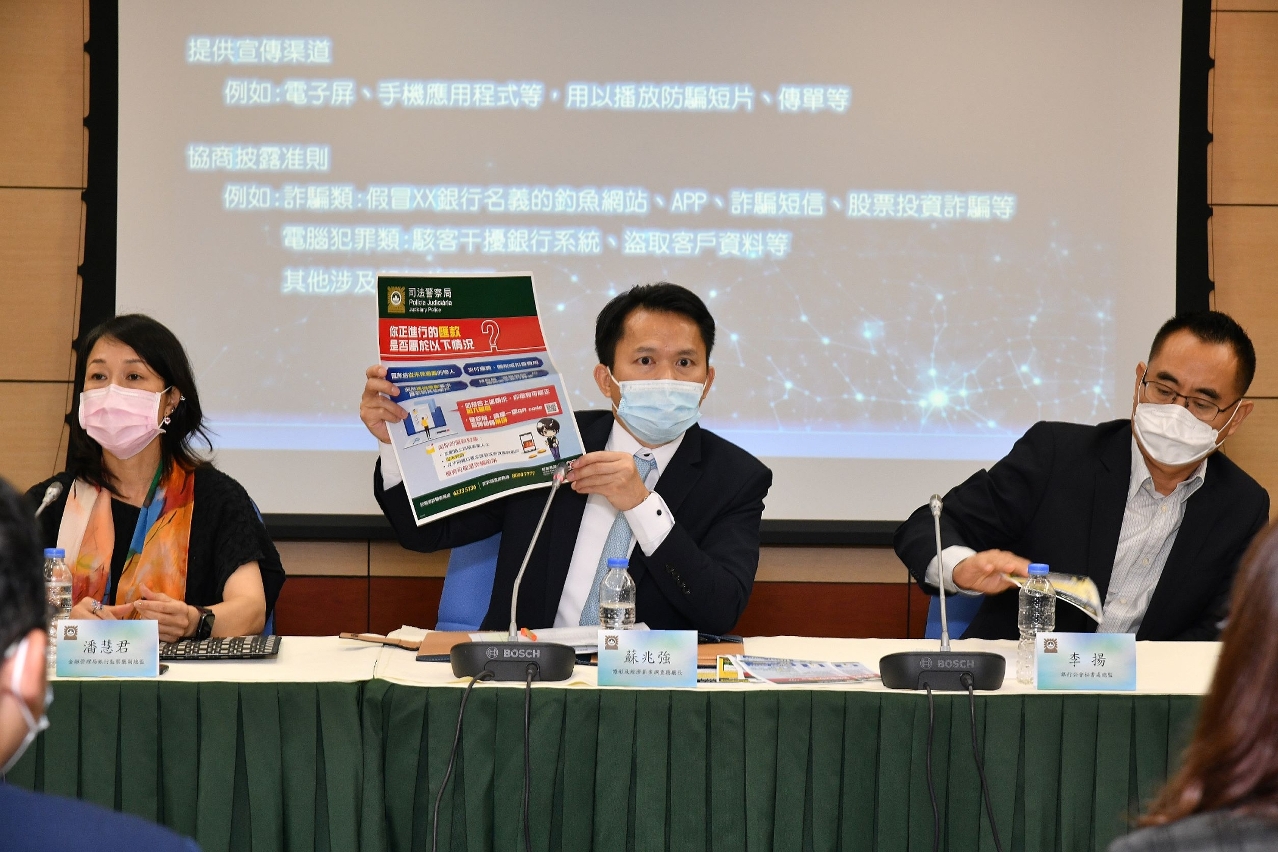 會上,蘇兆強廳長簡介近年澳門電信網絡詐騙案件的概況及總結過去兩年執行“可疑匯款勸退措施”的成效。因應近年涉及假冒政府部門人員、“網戀”等電信網絡詐騙案件多發,往往導致被害人損失巨大,司警局與銀行業界合作於2019年7月推行“可疑匯款勸退措施”,由銀行職員處理匯款服務時勸止可能墮入騙案的客戶繼續匯款,以減少潛在被害人的經濟損失。該項措施推行至今成功勸退並阻止相關市民匯出款項達一千多萬澳門元,成效顯著。