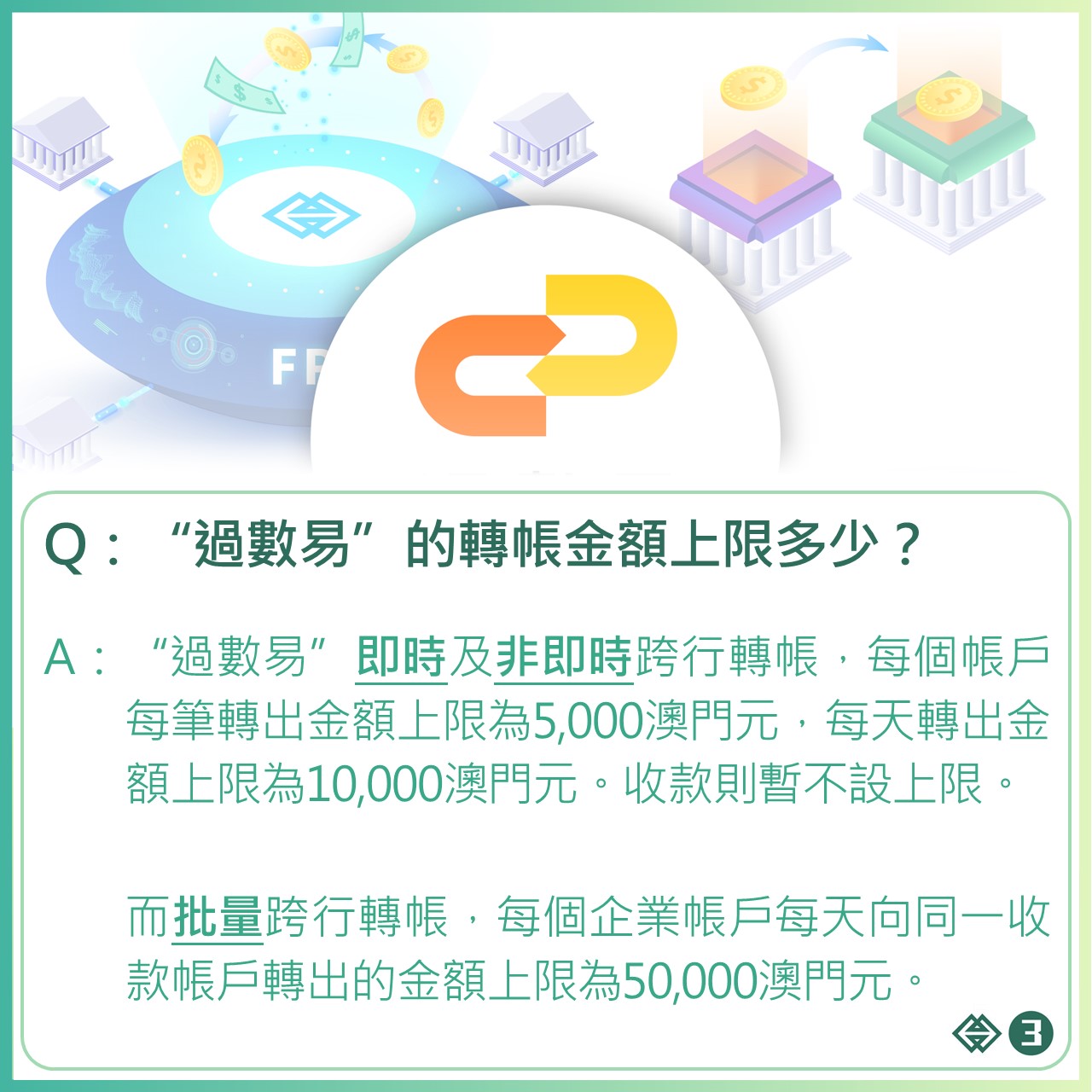 金管局表示,即時跨行轉帳每戶每筆轉出金額上限為5,000澳門元,每日上限則為10,000澳門元,有關金額的釐訂是從用戶體驗及風險管理作出平衡,亦諮詢澳門銀行業界意見。市民及商戶如欲使用“過數易”收款,需透過網上銀行、手機銀行或親臨銀行櫃檯等任一渠道,向銀行登記使用手機號碼,或申請FPS ID代碼,以綁定本地銀行澳門元帳戶。