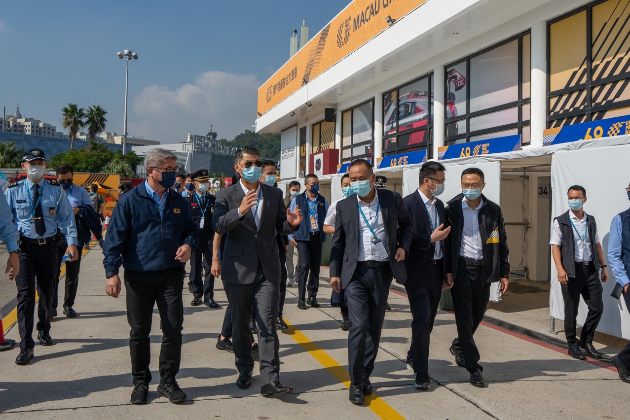 警察總局局長梁文昌、體育局局長兼大賽車組委會協調員潘永權、治安警察局局長吳錦華、消防局局長梁毓森、交通事務局局長林衍新及各部門主管,於今日早上到達澳門格蘭披治賽車大樓,聯同大賽車委員會負責人及各保安部隊代表,對不同單位及設施進行視察。期間瞭解各警務及應急單位的工作部署,為現場安保工作人員打氣並作出指示,全力做好大賽車的各項工作。隨後各相關單位的主管在指揮中心進行了工作會議及滙報相關工作情況。