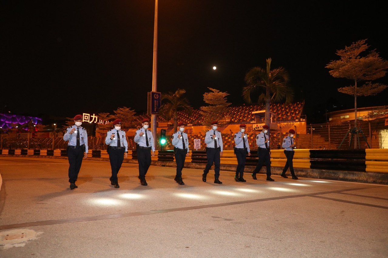 今(19)日進行「第68屆澳門格蘭披治大賽車」的首日賽事,治安警察局按照警務部署執行相應的工作。今日清晨,各參與賽事安保工作的警務人員進行列隊,並前往所屬崗位執行工作,對賽道採取封閉措施及安全監察,特警隊警犬組對賽道及看台等範圍進行安全檢查,排查可疑物品,確保整個賽道和周邊區域的安全。