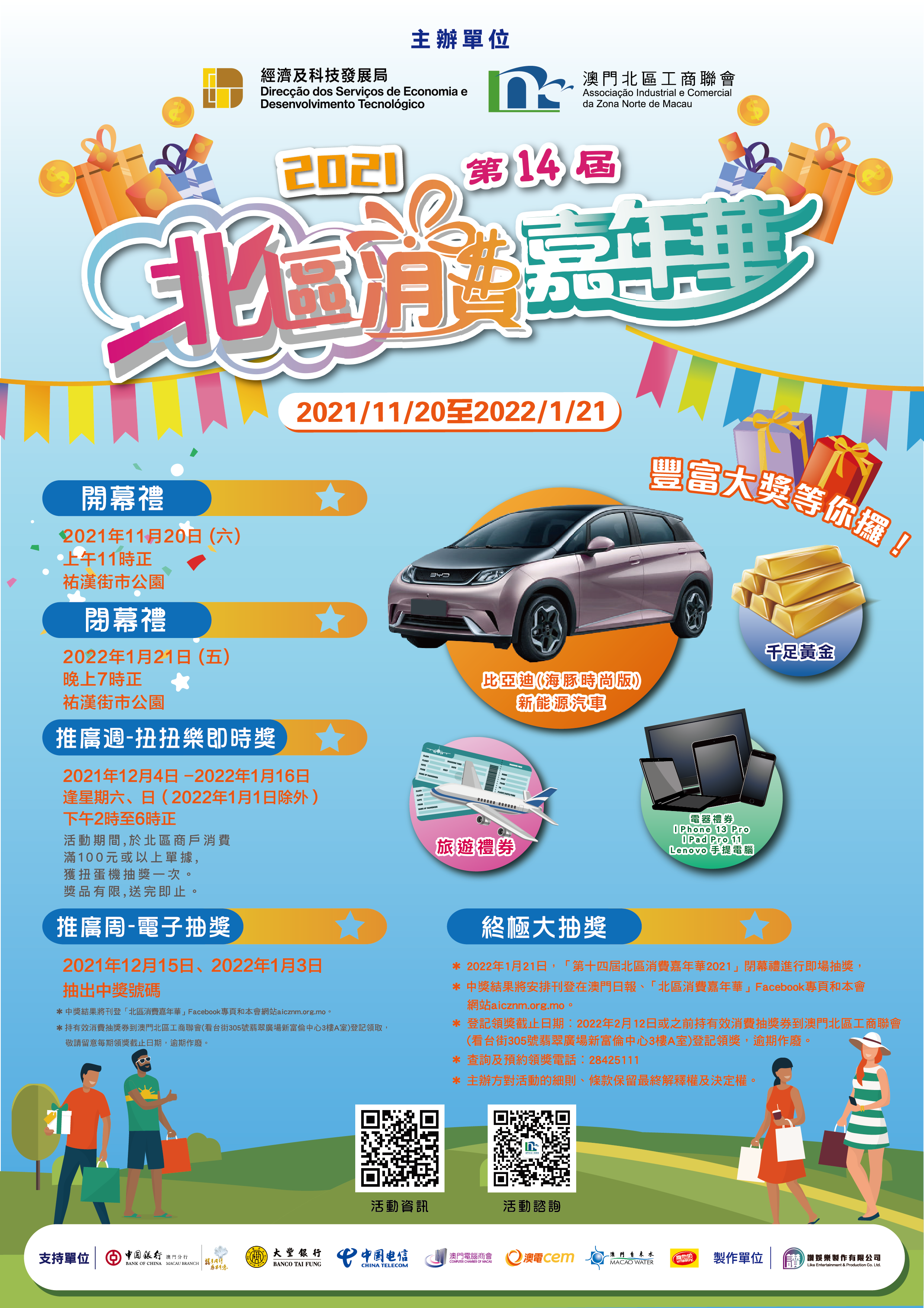 “2021北區消費嘉年華”活動於今日正式開始,至2022年1月21日結束。期間市民只要在北區的參與商戶消費滿指定金額,便可獲得終極大抽獎的抽獎券,參加者將有機會獲得新能源汽車、千足黃金、手機及家電等豐富獎品。