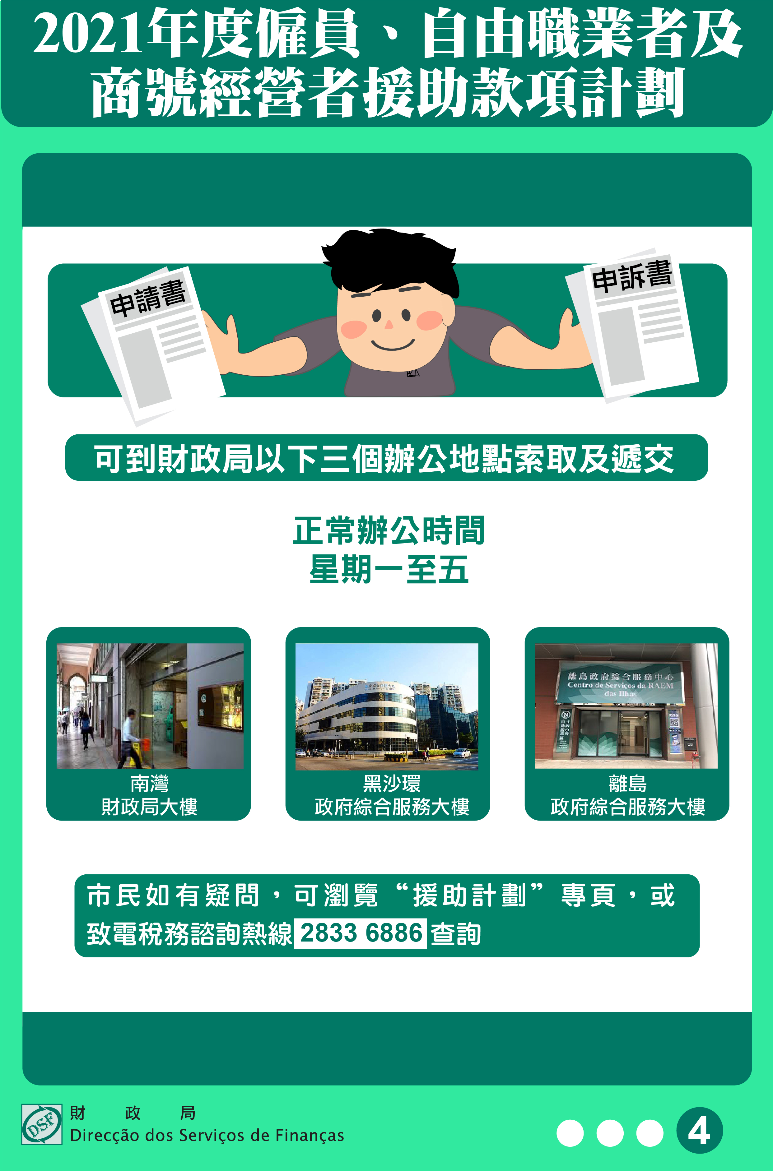 市民如有疑問,可瀏覽“援助計劃”專頁,或致電稅務諮詢熱線2833 6886查詢,亦可於辦公時間內親臨南灣財政局大樓、黑沙環政府綜合服務大樓、離島政府綜合服務中心的財政局服務站點,查詢或索取上述申請書及申訴書。