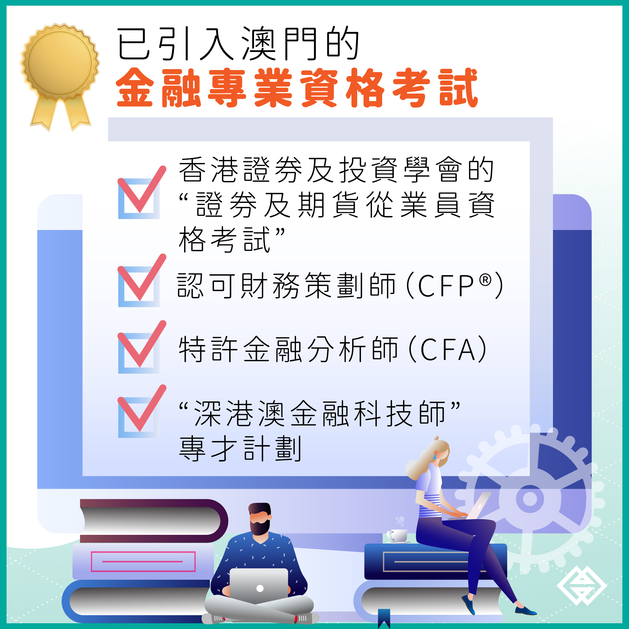 在金管局的推動下,澳門金融學會與多個專業資格協會合作,今年在澳門先後引入美國認可財務策劃師(CFP®)、香港“證券及期貨從業員資格考試”、“深港澳金融科技師”專才計劃三個專業資格考試,目前已舉辦了六場考試,吸引眾多金融從業員和在讀大學生報名。此外,特許金融分析師(CFA)亦已於今年在澳門開辦考試。