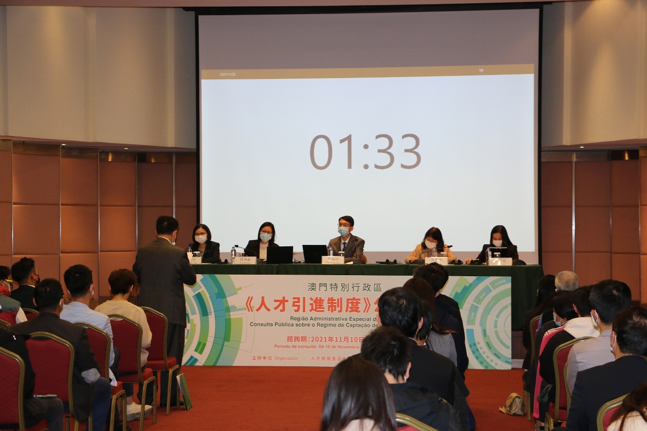 人才發展委員會於本月25日就《人才引進制度》公開諮詢舉行第3場諮詢會,由人才發展委員會周昶行秘書長、社會文化司司長辦公室簡佩敏顧問、人才發展委員會秘書處職務主管吳麗燕、高級技術員林雁玲及吳靜茹出席,向與會人士介紹諮詢文本的主要內容,並聽取與會人士的意見。由於公眾踴躍參與,是次社團和機構專場諮詢會亦歡迎市民參加,約100名人士出席了諮詢會,其中23人在會上發表意見和建議。