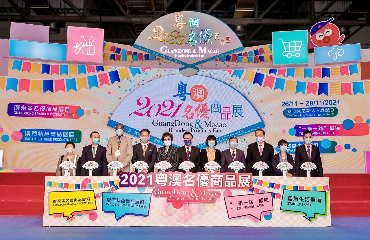 由澳門貿易投資促進局、廣東省商務廳合辦的“2021粵澳名優商品展”一連三天在澳門威尼斯人展館D舉行。今(27)日舉行開幕典禮,由澳門貿易投資促進局主席劉偉明、中華人民共和國外交部駐澳門特別行政區特派員公署副特派員王冬、中央人民政府駐澳門特別行政區聯絡辦公室經濟部副部長朱宏、印度尼西亞共和國駐華使館公使狄諾、廣東省人民政府副秘書長林積、中國—葡語國家經貿合作論壇(澳門)常設秘書處副秘書長贊東、廣東省商務廳副廳長馬樺、澳門歸僑總會理事長陳曉平、澳門特別行政區政府旅遊局局長文綺華、澳門特別行政區政府經濟及科技發展局副局長陳子慧、澳門貿易投資促進局執行委員李藻森主禮。