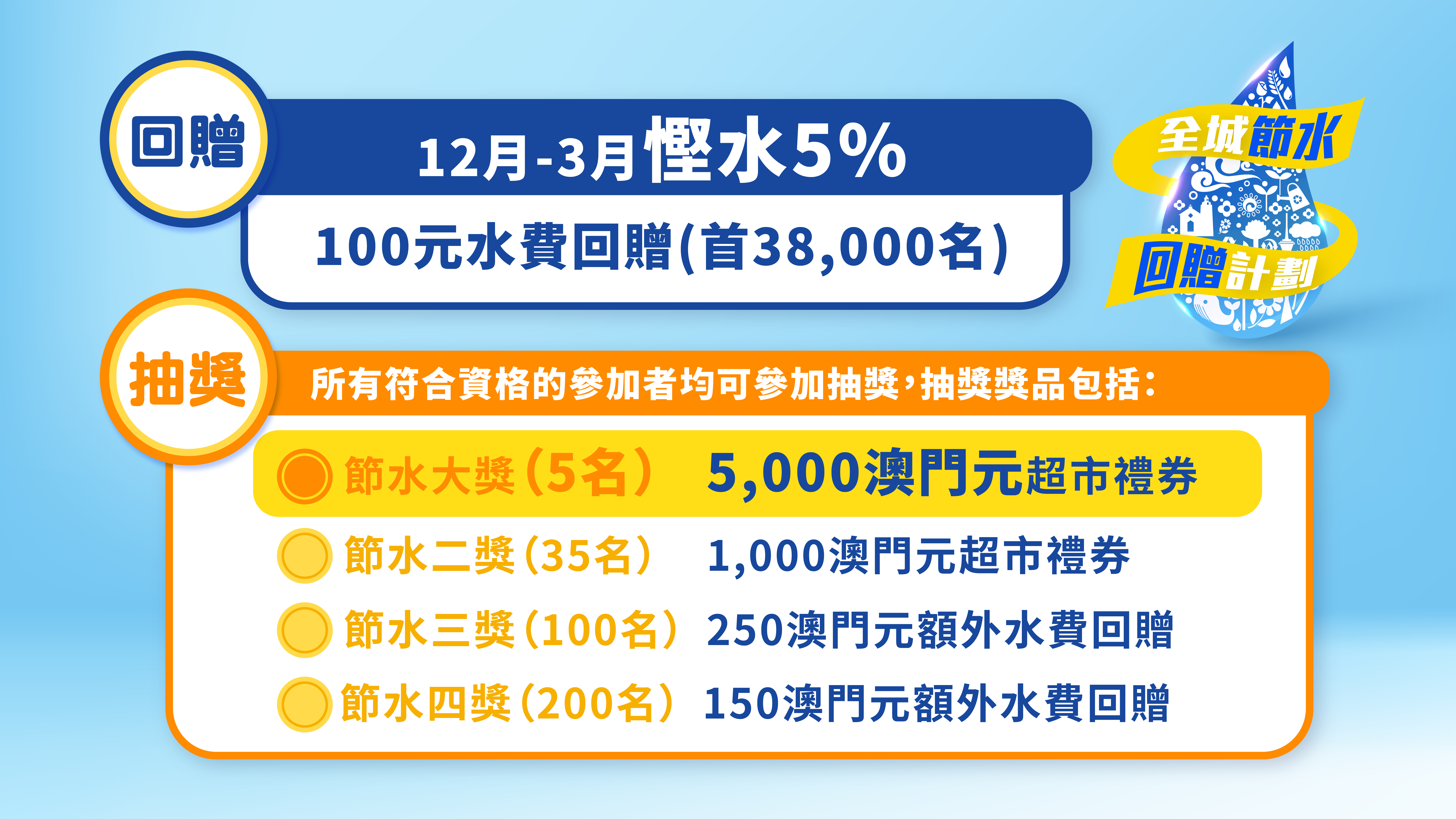 報名參加的首38,000戶,於2021年12月至2022年3月期間,用水量較去年同期節約5%至30%,即可獲得100元的水費回贈,同時自動參加抽獎,有機會獲得最多5,000元的超市禮券,抽獎獎品超過300份,報名期至2022年2月28日下午5時。