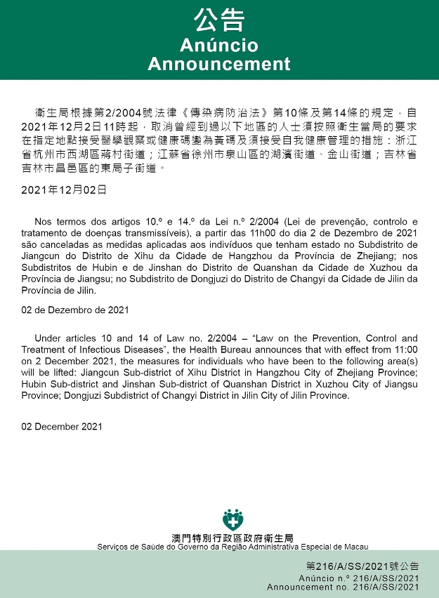自2021年12月2日早上11時起,取消曾經到過以下地區的人士須按照衛生當局的要求在指定地點接受醫學觀察或健康碼變為黃碼及須接受自我健康管理的措施:浙江省杭州市西湖區蔣村街道,江蘇省徐州市泉山區湖濱街道、金山街道,吉林省吉林市昌邑區的東局子街道。