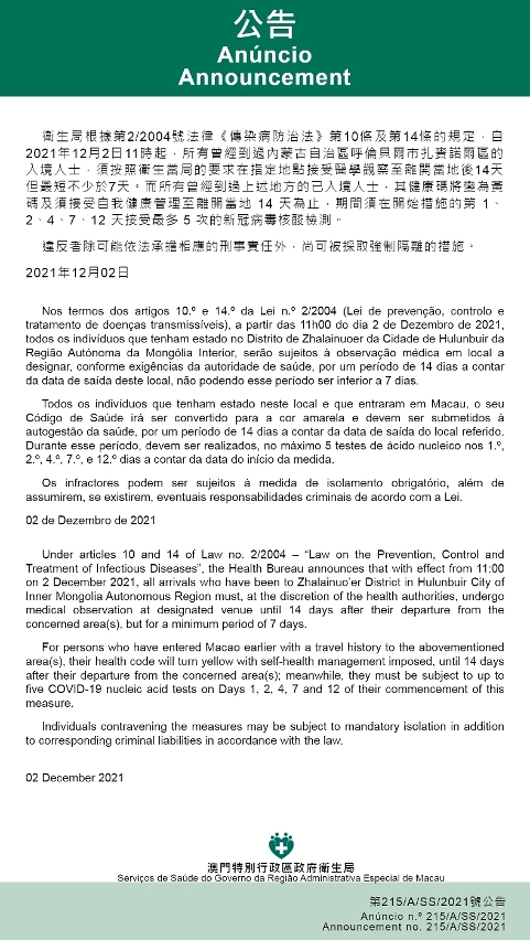 新型冠狀病毒感染應變協調中心(下稱“應變協調中心”)宣佈,因應內蒙古自治區的疫情變化,衛生局根據第2/2004號法律《傳染病防治法》第10條和第14條的規定,自2021年12月2日早上11時起,所有曾經到過內蒙古自治區呼倫貝爾市扎賚諾爾區的入境人士,須按照衛生當局的要求在指定地點接受醫學觀察至離開當地後14天但最短不少於7天。而所有曾經到過上述地方的已入境人士,其健康碼將變為黃碼及須接受自我健康管理至離開當地 14 天為止,期間須在開始措施的第 1、2、4、7、12 天接受最多 5 次的新冠病毒核酸檢測。免費核酸檢測預約連結為 https://app.ssm.gov.mo/mandatoryrnatestbook。核酸檢測結果不會上載至澳門健康碼亦不可作為出入境用途。如需將核酸檢測結果在澳門健康碼顯示,則須自費檢測。