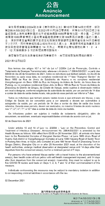 另修改第206/A/SS/2021號公告,所有曾經到過上海市浦東新區花木街道及三林鎮、青浦區趙巷鎮的人士,修改為:所有在11月25日或之後曾經到過上海市浦東新區的花木街道錦繡路1650弄香梅花園一期小區、三林鎮海陽路1080弄香樟苑小區或青浦區趙巷鎮業文路189弄西郊錦廬小區。有關的防疫措施不變。