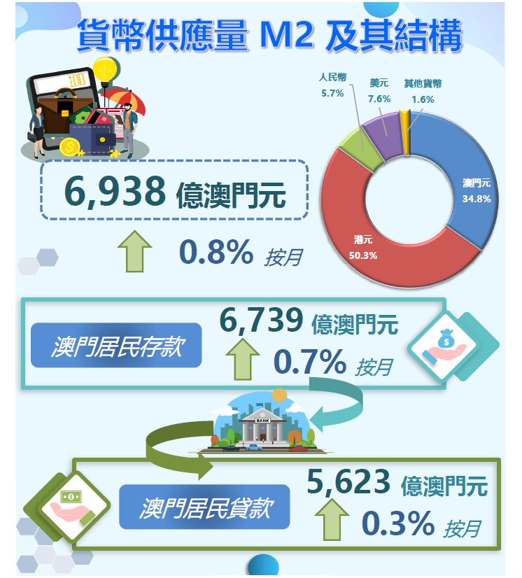 流通貨幣上升2.2%,而活期存款則下跌0.5%,M1因而較上月增加0.2%。與此同時,準貨幣負債上升0.8%,因此包括M1及準貨幣負債的廣義貨幣供應量M2遂按月上升0.8%,金額為6,938億澳門元。若與2020年同期比較,M1及M2同告增加1.2%。按幣種分析,澳門元、港元、人民幣及美元在M2的比重分別為34.8%、50.3%、5.7%及7.6%。