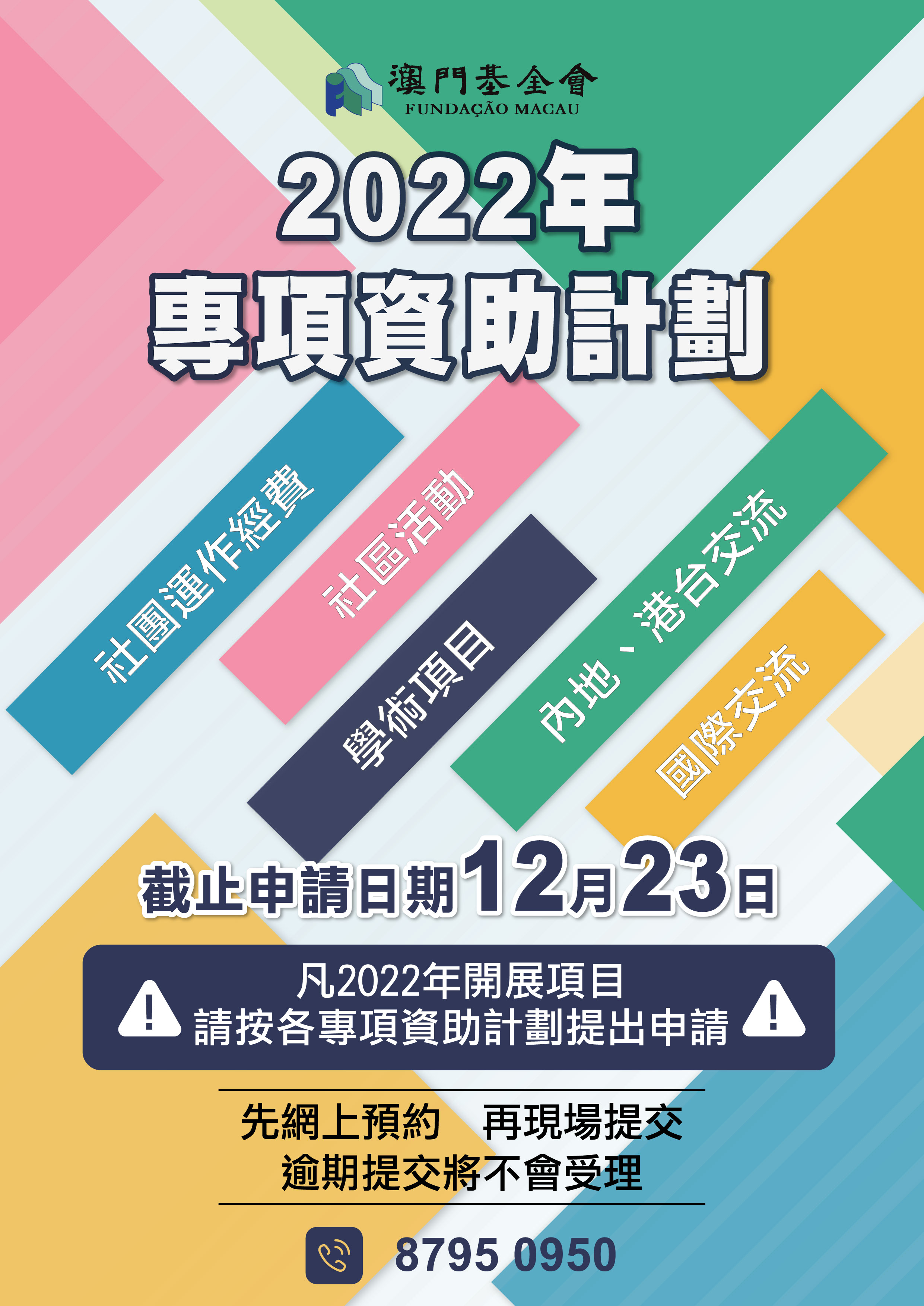 為推進資助制度的改革,建立更客觀、公平的審批機制,澳基會早前推出上述五個領域的專項資助計劃,有意申請於2022年舉辦相關領域的活動的社團,必須於專項資助計劃的申請期內提交申請,逾期提交的申請將一概不會受理。澳基會強調,透過專項資助計劃,實行集中申請,統一評審,擇優批給,是希望提升資助工作的透明度和效益,讓公共資源更精準地投放到符合社會需求的項目上,並再次提醒社團,澳基會已改變過往“隨到隨批”資助審批模式,不再全年開放予社團提交申請,且目前接受申請的僅為上述五個計劃,呼籲申請者盡快提交申請。