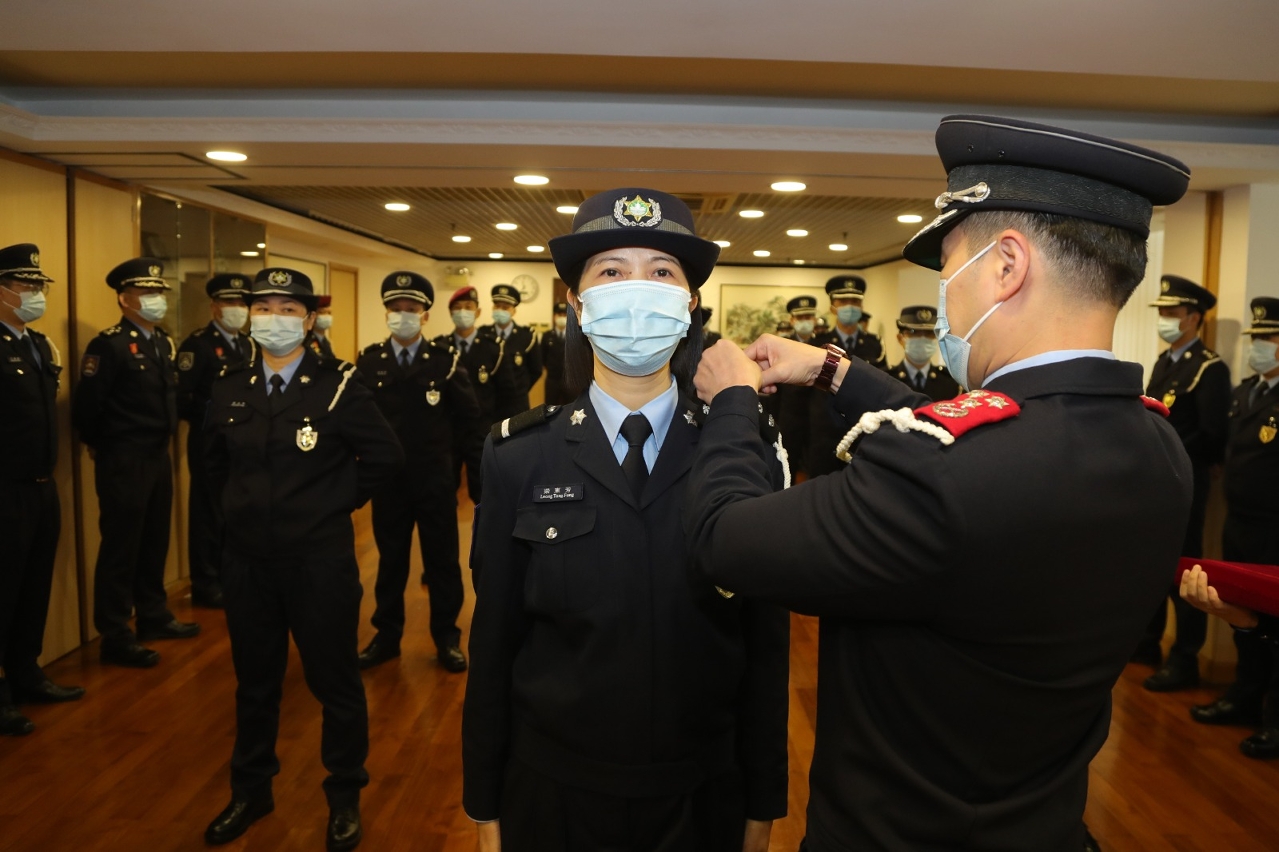 儀式簡單而莊重,出席的領導和各部門主管為獲晉升警長的人員戴上新肩章,黃偉鴻代局長於致辭時祝賀並勉勵他們今後需肩負起更重要的職責與使命,在新的崗位上,必須充分發揮過往累積的豐富經驗和專業知識,時刻保持警覺,居安思危,為維護社會安全繁榮穩定竭盡所能;並表示本澳現時仍受疫情影響,對總體安全環境帶來諸多挑戰,但在特區政府的領導以及治安警察局全體人員上下一心共同面對下,本澳的防疫工作取得顯著的成效;此外,在防疫抗疫的同時,治安警察局持續打擊各類違法犯罪行為,為維護國家安全和澳門市民大眾生命財產提供強大的保障。