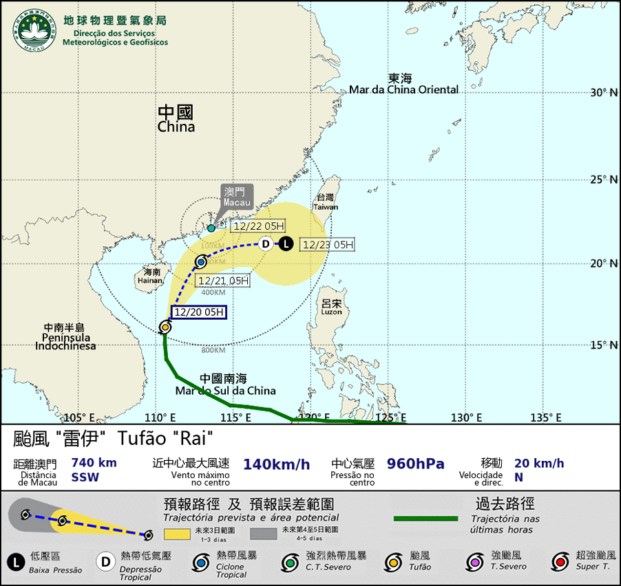 颱風「雷伊」集結在本澳西南偏南約 740 公里,正逐漸接近本澳。預料將在本澳以南約200公里內掠過。與「雷伊」相關的雨帶會在20日至21日期間影響本澳,雨勢會較為頻密及持續時間較長,風力將間中達6級及有陣風。雖然「雷伊」強度會有所減弱,但由於路徑較預期更接近本澳,請市民密切留意天氣變化並關注最新風暴消息。