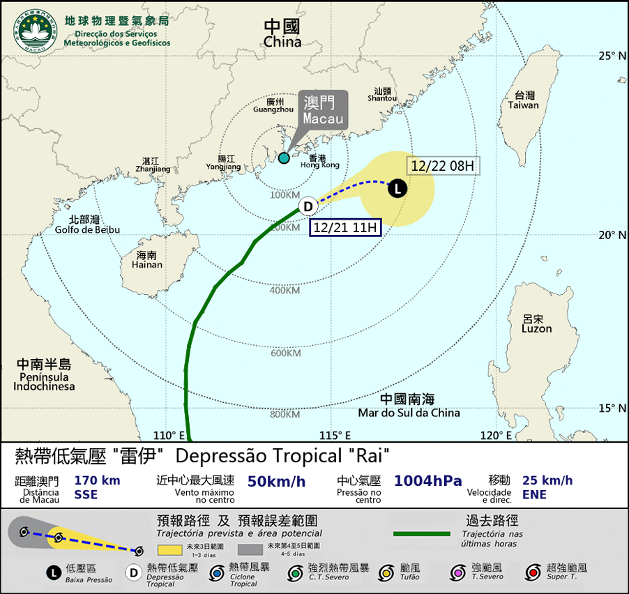 「雷伊」已於本澳以南約200公里附近掠過,正逐漸遠離並快速減弱消散,與「雷伊」相關的殘餘雨帶亦會於日間逐漸減弱。因此,本局將於未來數小時取消所有熱帶氣旋警告信號。請巿民留意本局最新天氣消息。