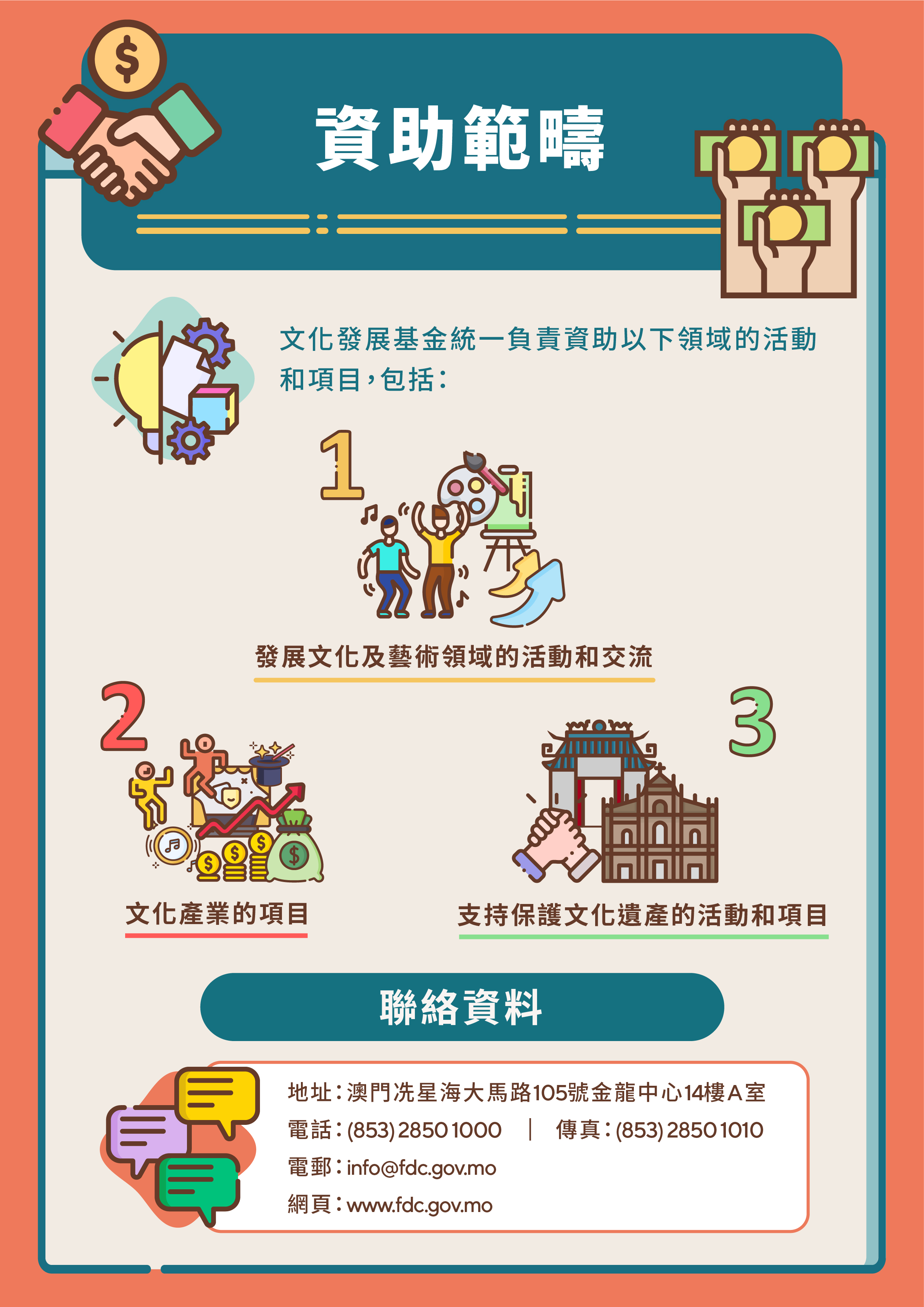 如有查詢,請致電2850 1000或電郵至info@fdc.gov.mo向文化發展基金了解。
