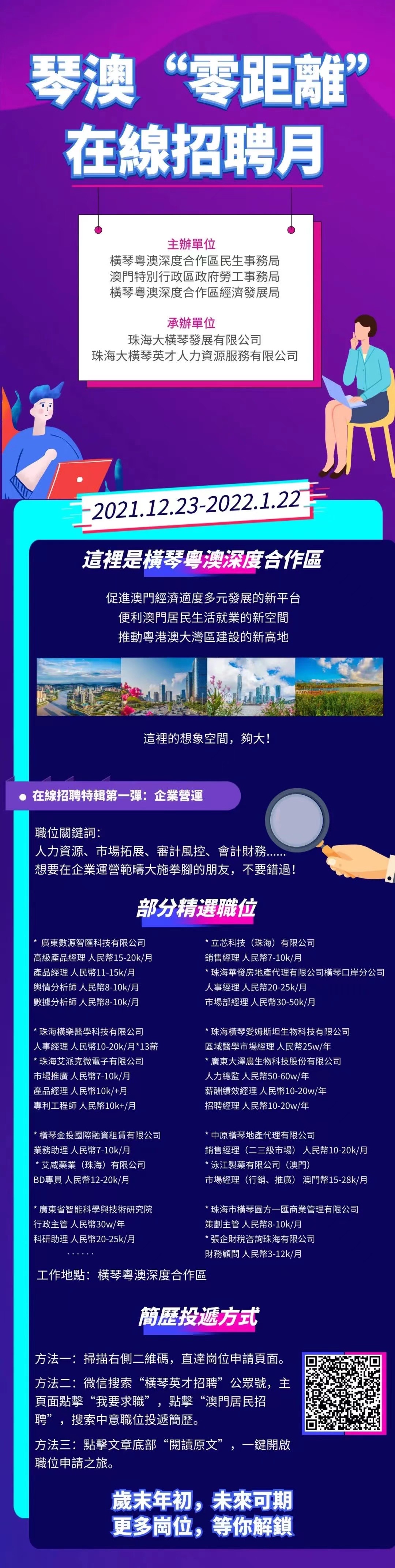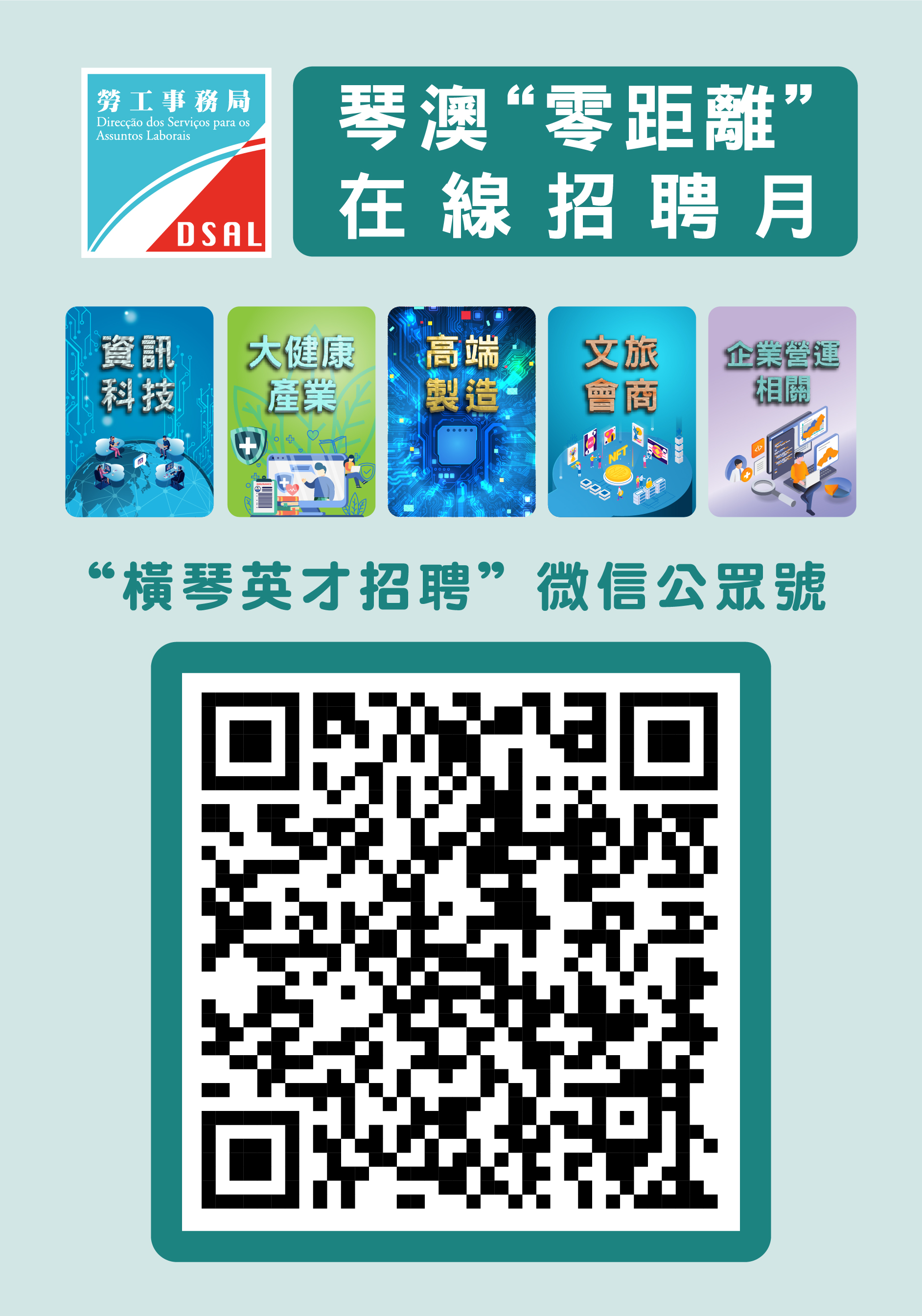 勞工事務局與橫琴粵澳深度合作區的民生事務局、經濟發展局合辦”琴澳零距離”在線招聘月活動,提供400個工作崗位。活動已於2021年12月23日啟動,為期1個月。