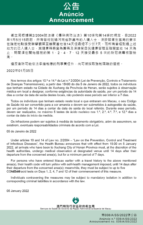 新型冠狀病毒感染應變協調中心(下稱“應變協調中心”)宣佈,因應河南省的疫情變化,自2022年1月5日下午3時起,所有曾經到過河南省許昌市的入境人士,須按照衛生當局的要求在指定地點接受醫學觀察至離開當地後14天但最短不少於7天。而所有曾經到過上述地方的已入境人士,其健康碼將變為黃碼及須接受自我健康管理至離開當地 14 天為止,期間須在開始措施的第1、2、4、7、12 天接受最多 5 次的新冠病毒核酸檢測。免費核酸檢測預約連結為 https://app.ssm.gov.mo/mandatoryrnatestbook 。核酸檢測結果不會上載至澳門健康碼亦不可作為出入境用途。如需將核酸檢測結果在澳門健康碼顯示,則須自費檢測。