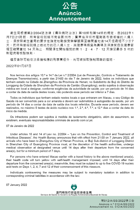 新型冠狀病毒感染應變協調中心(下稱“應變協調中心”)宣佈,因應河南省和廣東省的疫情變化,自2022年1月7日晚上9時起,所有曾經到過河南省鄭州市;廣東省深圳市龍崗區布吉街道的入境人士,須按照衛生當局的要求在指定地點接受醫學觀察至離開當地後14天但最短不少於7天。而所有曾經到過上述地方的已入境人士,其健康碼將變為黃碼及須接受自我健康管理至離開當地 14 天為止,期間須在開始措施的第1、2、4、7、12 天接受最多 5 次的新冠病毒核酸檢測。免費核酸檢測預約連結為https://app.ssm.gov.mo/mandatoryrnatestbook。核酸檢測結果不會上載至澳門健康碼亦不可作為出入境用途。如需將核酸檢測結果在澳門健康碼顯示,則須自費檢測。