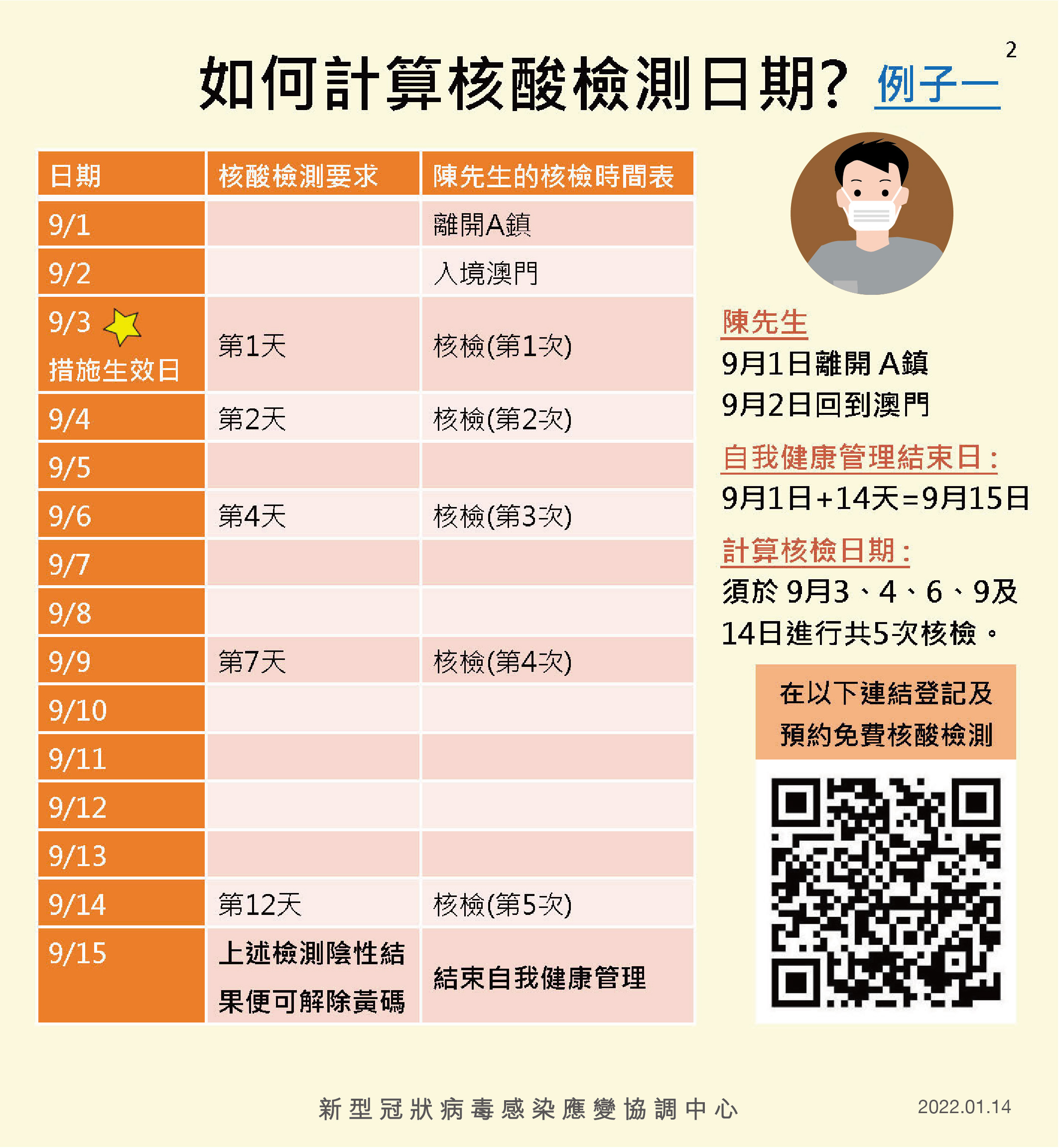 免費核酸檢測預約連結為 https://app.ssm.gov.mo/mandatoryrnatestbook 。核酸檢測結果不會上載至澳門健康碼亦不可作為出入境用途。如需將核酸檢測結果在澳門健康碼顯示,則須自費檢測。