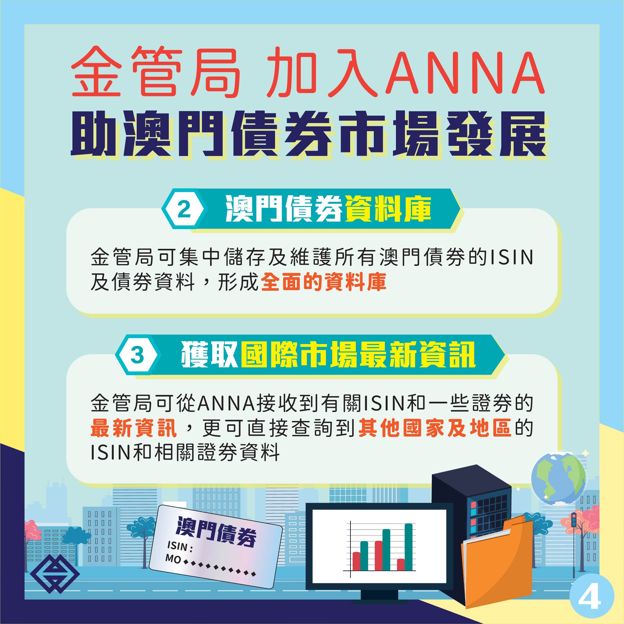 為配合澳門債券市場發展,便利在澳門發行的債券獲取國際證券識別碼(International Securities Identification Number, ISIN),金管局已加入國家編碼機構協會(Association of National Numbering Agencies, ANNA),並完成編碼系統對接,今(18)日起可為在澳門發行的債券編配ISIN,提高債券發行效率。