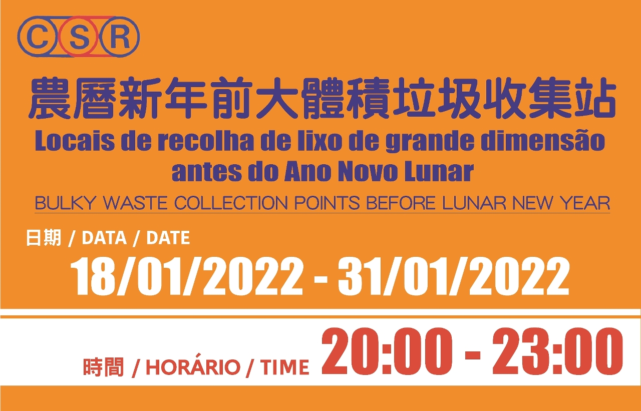 農曆新年將至,為保持社區環境衛生,市政署於1月18至31日期間,在本澳各區設134個大體積垃圾收集站,方便市民棄置大掃除垃圾及大體積家具;而2月1至18日期間,大體積垃圾收集站將改為年花年桔收集站,回收市民棄用的年花年桔作綠化用途。