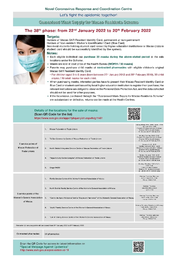新型冠狀病毒感染應變協調中心今(21)日公佈,第38輪保障口罩供應澳門居民計劃(下稱“口罩計劃”)於本周六(22日)開始,售賣期間為30日,即2022年1月22日至2022年2月20日,期間每人可一次性購買30個口罩,售價合共24澳門元。衛生局協議藥房、本澳2個社團(工聯、婦聯)繼續提供售賣口罩服務。即全澳共有64個售賣點,服務時間詳見附圖。透過口罩計劃購買的口罩,如有不合格或次貨可退回衛生中心。