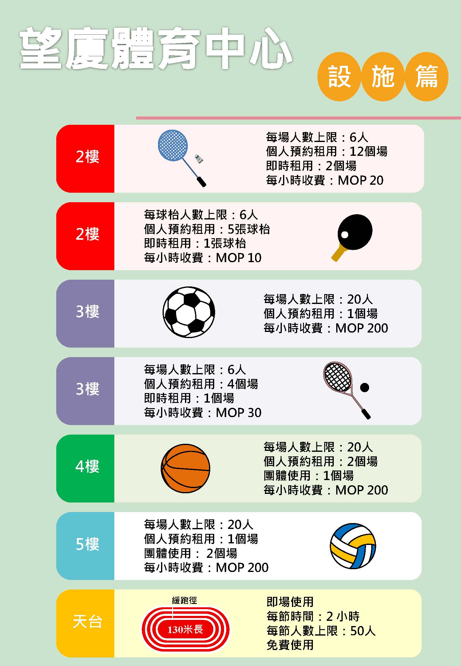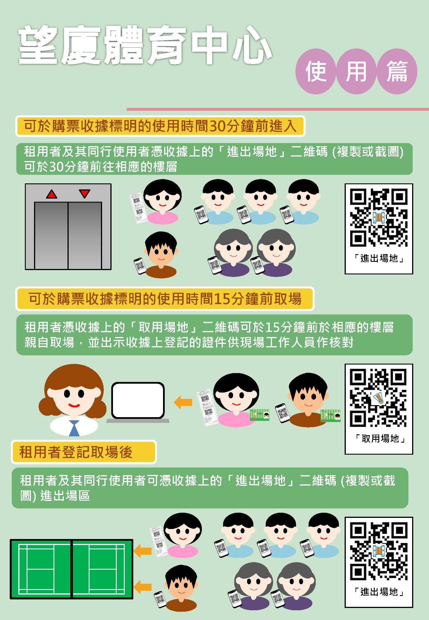 望廈體育中心樓高五層,每層設置了不同的體育設施,以受大眾歡迎的體育項目為主,為市民提供了可進行多項體育運動的鍛鍊空間,鼓勵全民運動的健康生活模式。為便利市民安排日常運動計劃,望廈體育中心的運動場地以電子化購票方式為主。另外,為配合防疫措施,望廈體育中心實施入場人數限制,以避免人群過度密集,請市民盡早預約場地。當租用者成功租用體育設施後,將獲得印有兩個二維碼的購票收據,租用者及同行使用者可憑當中「進出場地」二維碼於收據標明的使用時間開始30分鐘前進入及前往相應的樓層。然後,租用者可於收據標明的使用時間開始15分鐘前,憑收據上「取用場地」二維碼在相應的樓層親自取場,並出示收據上登記的證件供現場工作人員作核對。當租用者取用體育設施後,其同行使用者方可憑收據上的「進出場地」二維碼(複製或截圖)進出場區。