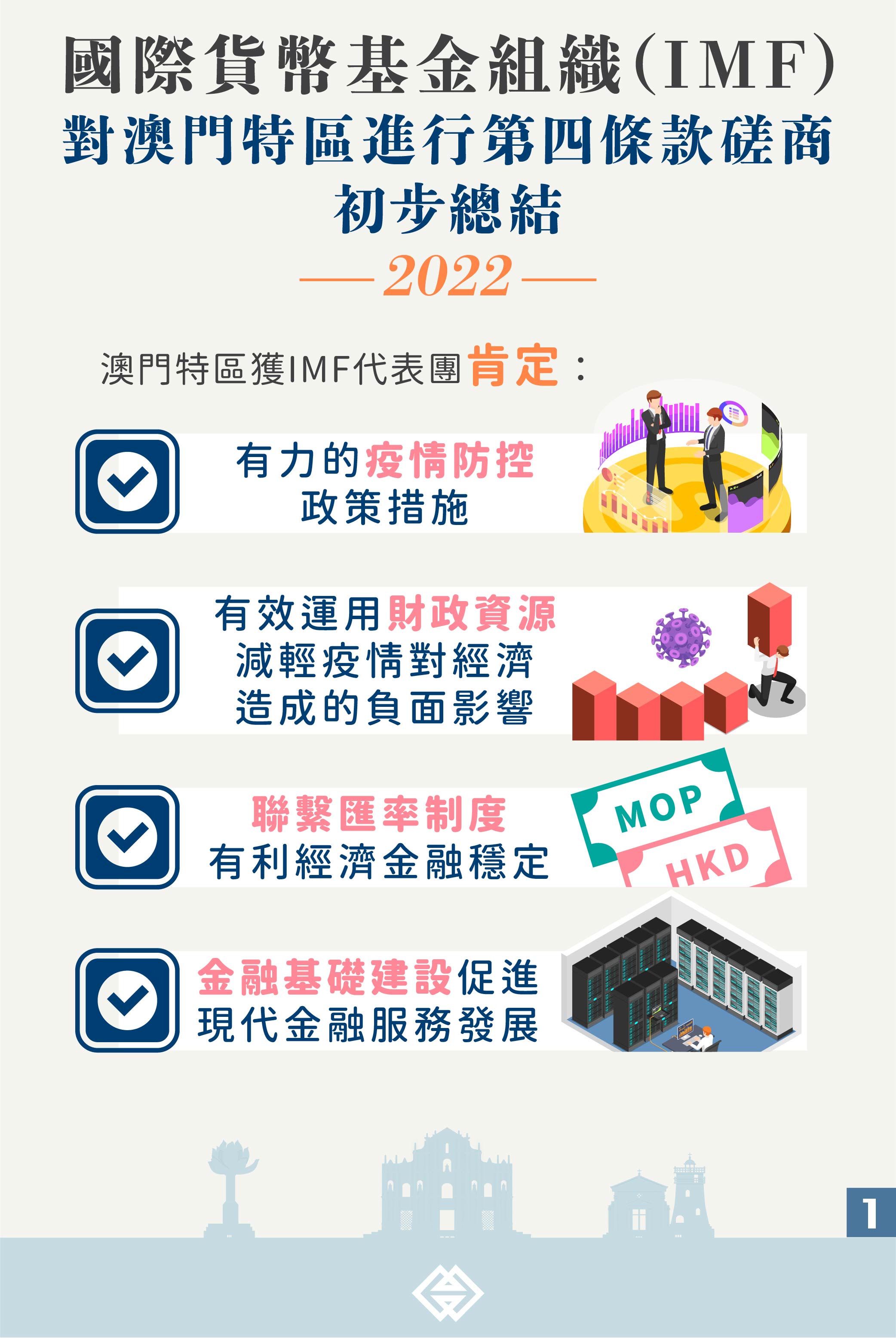 在《2022年第四條款磋商代表團工作人員總結聲明》中,IMF專家認同澳門特區政府有力的疫情防控政策措施,以及運用財政資源減輕疫情對經濟造成的負面影響。同時,澳門元與港元的聯繫匯率制度繼續有利於澳門特區,支持其經濟金融穩定。