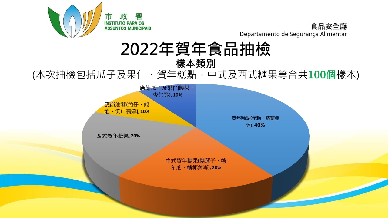 農曆新年將至,為保障市民食用安全,市政署聯同消費者委員會於本澳各區食肆、超市及零售店舖等,合共抽檢一百款賀年食品樣本。除了早前公佈的七款中式糖果樣本二氧化硫含量超標外,其餘賀年食品樣本的檢測結果未見異常。