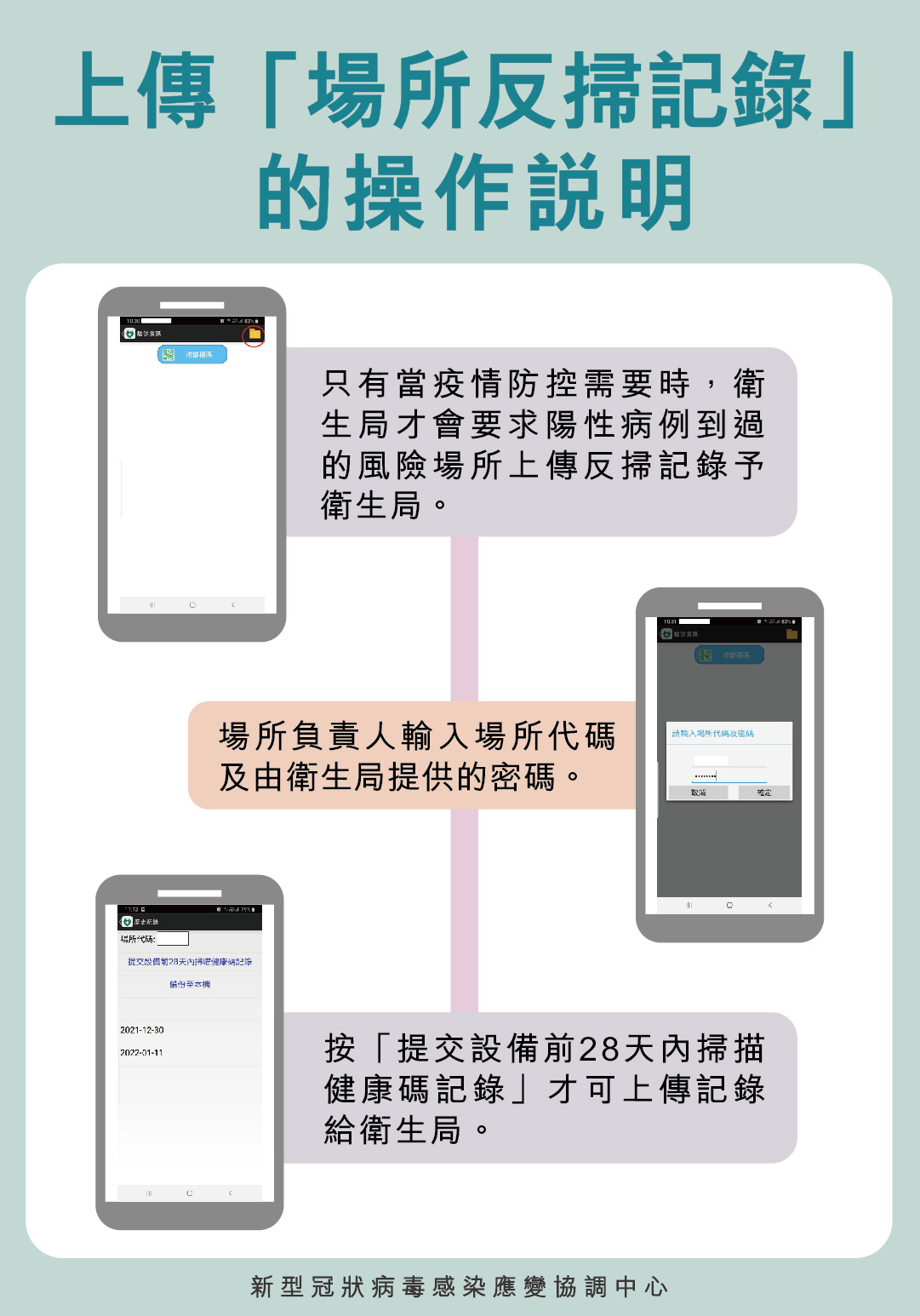 應變協調中心強調,透過「反掃」入場人士所出示有效的「澳門健康碼」,入場人士的入場記錄只會在場所的工作手機或其他電子設備內保存28天,資料僅包括健康碼識別碼及反掃時間,場所無法回顧或查閱記錄。同時,只有當疫情防控需要時,衛生局才會要求陽性病例到過的風險場所上傳「反掃」記錄予衛生局。屆時,場所負責人輸入場所代碼及由衛生局提供的密碼,按「提交設備前28天內掃描健康碼記錄」才可上傳記錄給衛生局。