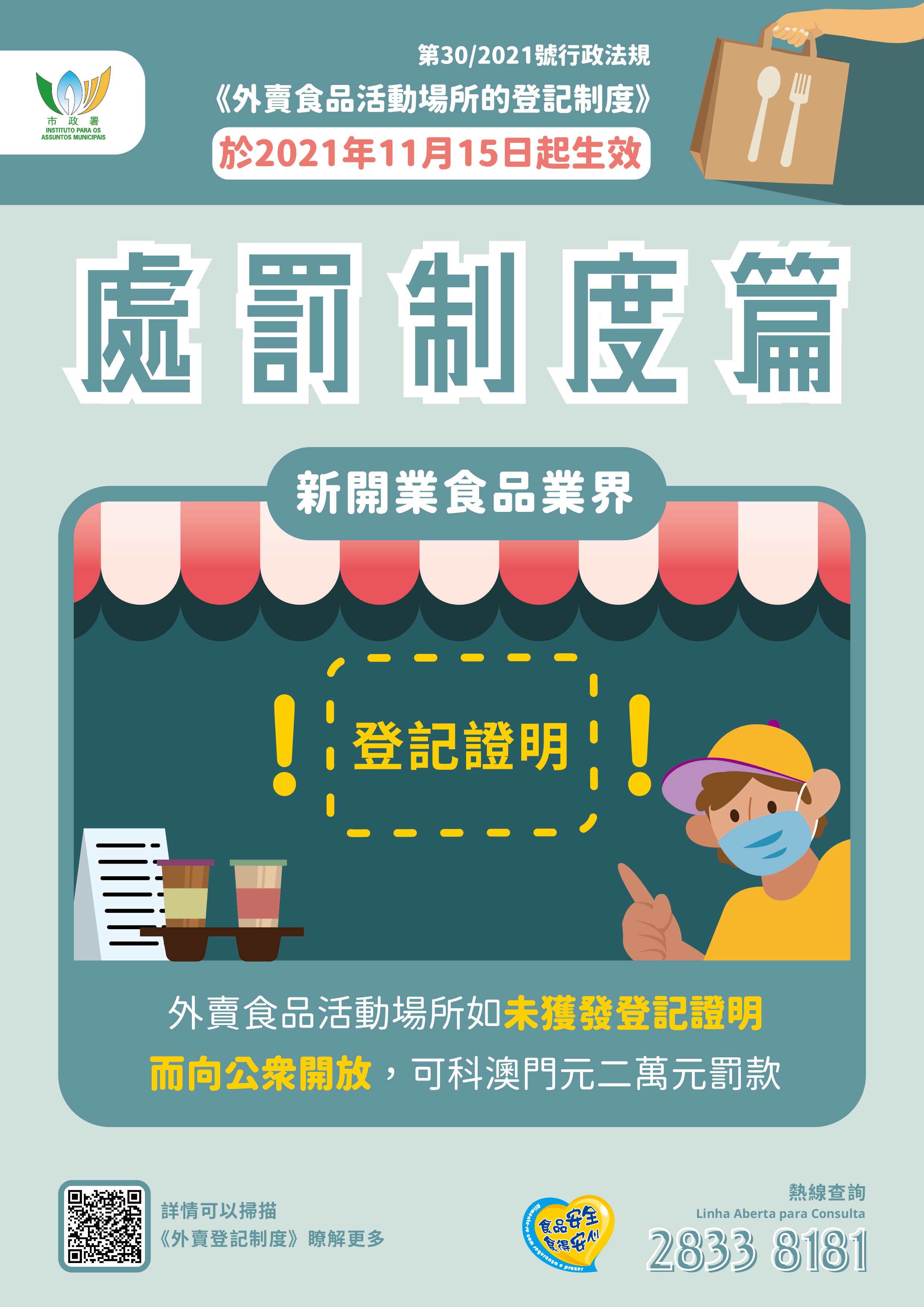 如對外賣登記制度有任何疑問,可登入市政署食安資訊網www.foodsafety.gov.mo或手機應用程式內的“外賣食品活動場所的登記制度”專頁瞭解詳情,或可致電食安專線2833 8181查詢。