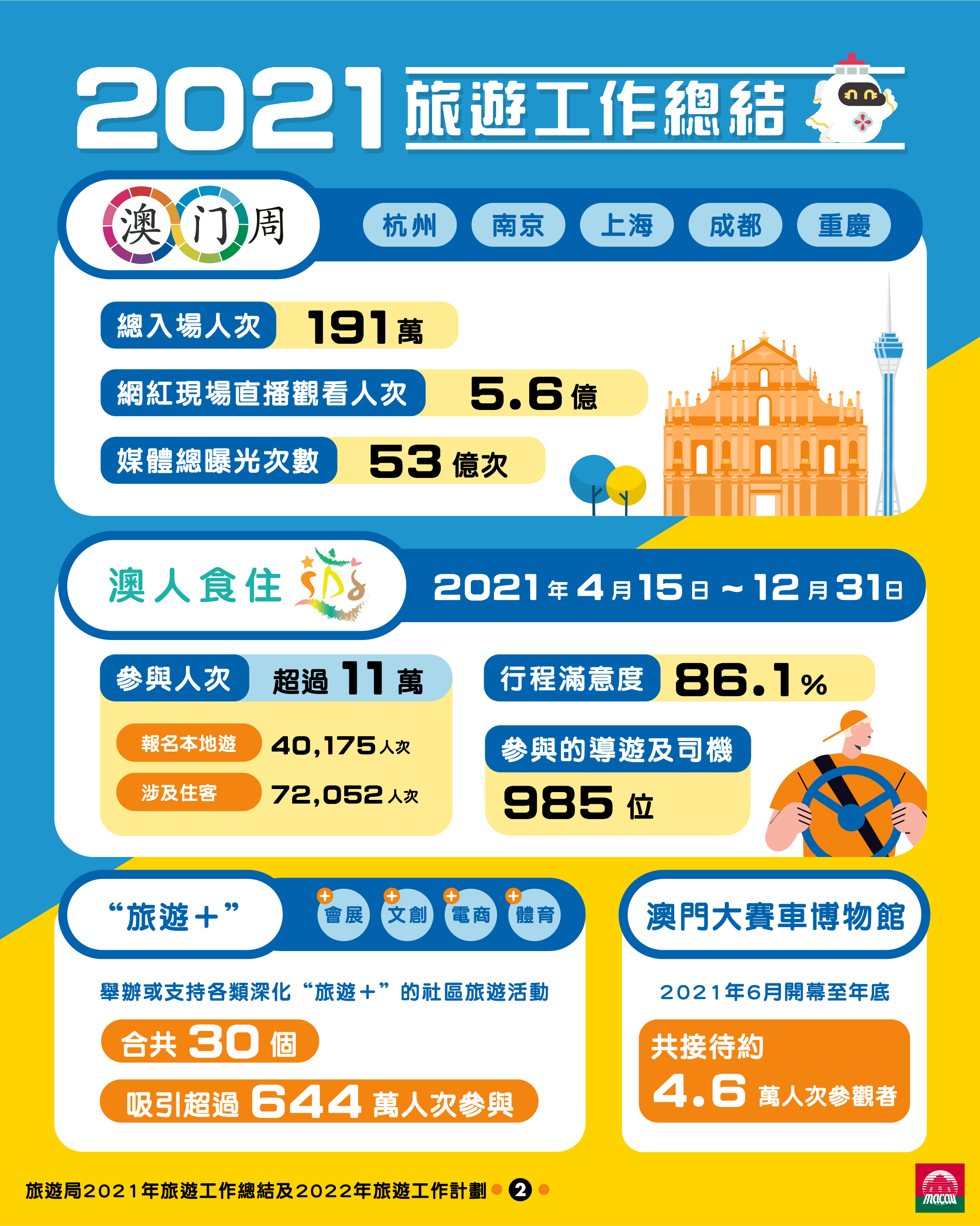 有關旅遊局2021年工作回顧及2022年重點工作,請參考上載於澳門旅遊業界網站的“旅遊局年度工作簡報”,連結:https://industry.macaotourism.gov.mo/file/pdf/2022_Annual_Report.pdf。