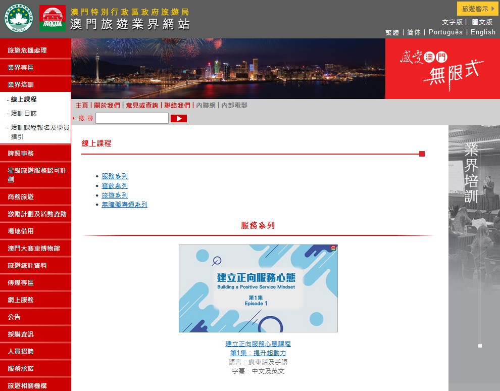 歡迎旅遊業界和有興趣人士透過旅遊局的澳門旅遊業界網站(https://industry.macaotourism.gov.mo)連結至“業界培訓-線上課程”觀看影片,費用全免。
