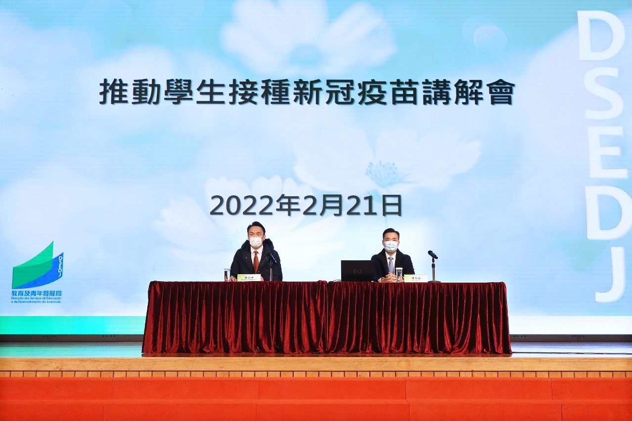 為保護兒童及青少年的健康,推動非高等教育學校學生接種新冠疫苗刻不容緩。教青局聯同衛生局於今日(2月21日)下午假教業中學禮堂舉行“推動學生接種新冠疫苗講解會”,教青局局長龔志明、衛生局局長羅奕龍,以及77所非高等教育學校負責人和代表出席講解會。