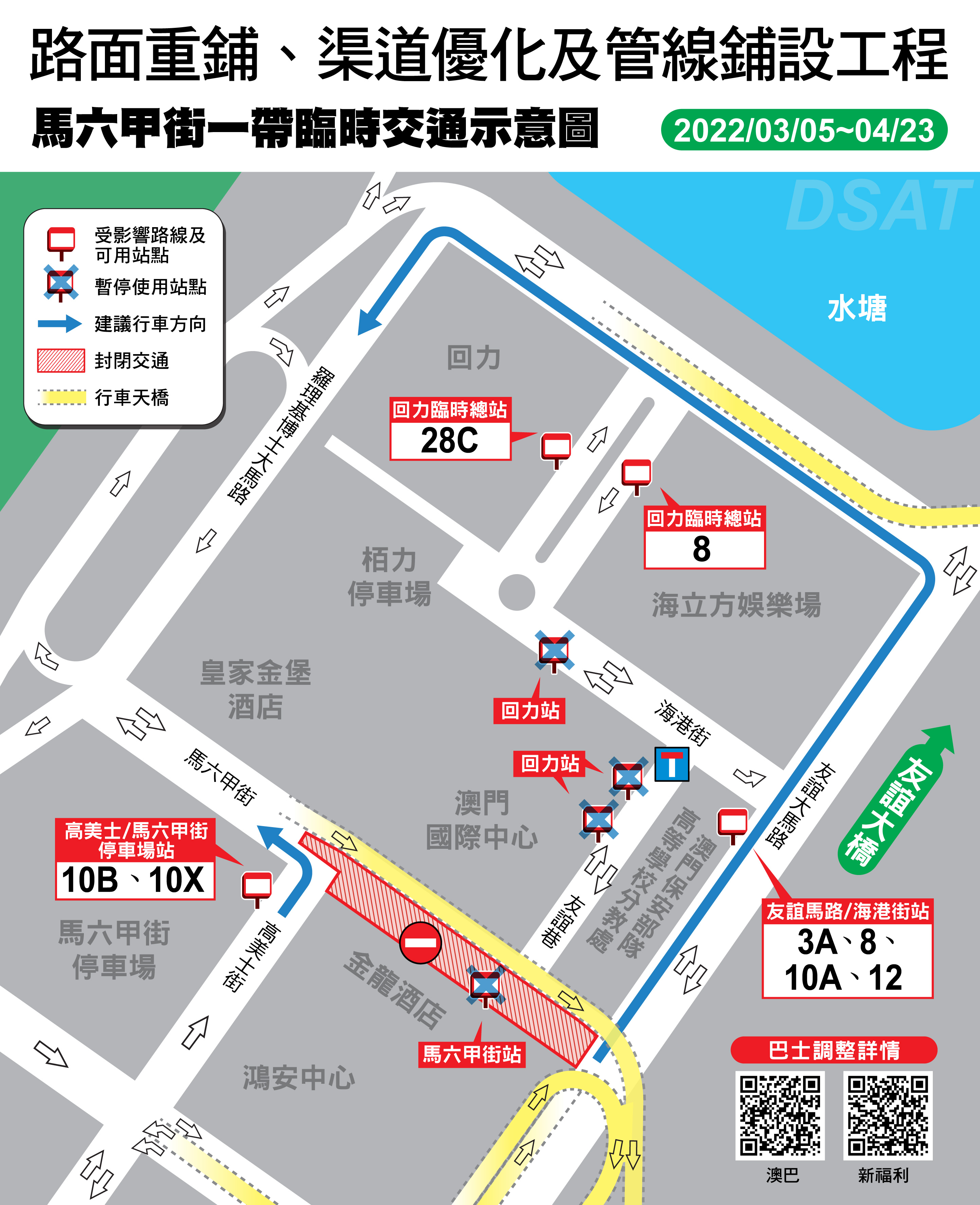 巴士方面,3月5日(周六)首班車起至4月23日(周六),“馬六甲街”及“回力”巴士站暫停使用,水塘巷設立臨時巴士總站。3A、8、10A、10B、10X、12及28C路線巴士需改道行駛及臨時停靠其他站點,而56路線則改道行駛但停靠站點不變。詳情可查閱澳巴網頁http://www.tcm.com.mo/web/NewsVB/data/782_cn.pdf 及新福利網頁https://www.transmac.com.mo/route-change/tr-047-2022/