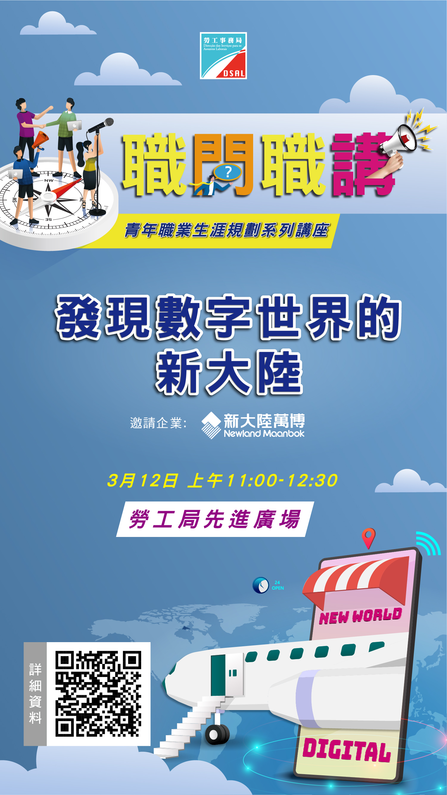 為協助澳門青年探索新產業發展前景、開拓多元就業發展空間及做好就業準備,勞工事務局將於2022年3月12日舉辦題為“發現數字世界的新大陸”行業講座,邀請相關企業資深代表講解,主要介紹澳門電子支付發展、相關人才發展前景及職位需求,並即場回答青年對有關行業前景和擇業方面的查詢。