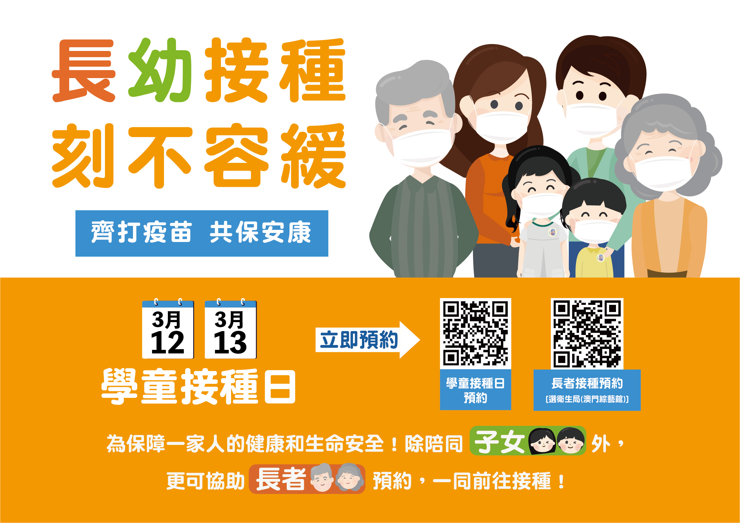 鑑於鄰近地區疫情嚴重,當地相關部門對死者接種新冠疫苗情況的分析,發現當中未完成疫苗接種者佔超過9成。教青局再次提醒,為3歲或以上的子女及長者接種疫苗同樣刻不容緩,且疫苗至少在兩個星期後才產生足夠免疫力,呼籲家長儘快陪同子女及家中長者接種新冠疫苗。家長可透過掃描圖中二維碼為子女及長者預約,並帶備家長/法定監護人及接種疫苗者的身份證明文件到現場,由醫務人員即場進行評估及接種。