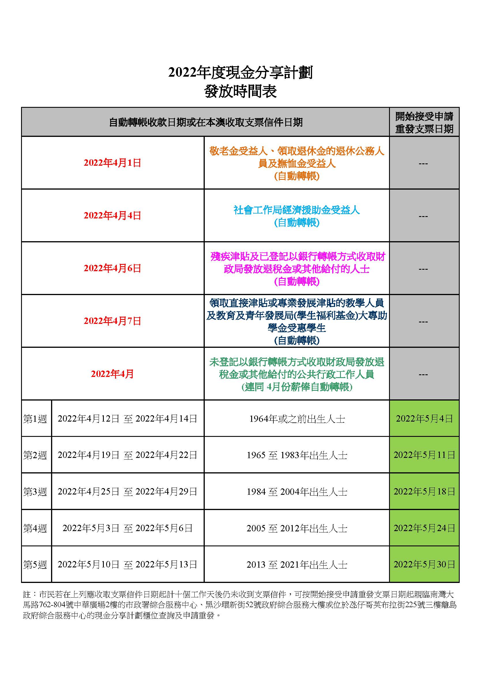 基於新型冠狀病毒肺炎疫情反覆,對本澳經濟復甦帶來不確定性,為紓解民困,在《2022財政年度施政報告》中,特區政府堅持民生福利開支不減少,繼續實施上一年度的稅務優惠措施,並延續教育、醫療、社會保障及現金分享計劃等多項惠民措施。在本年度現金分享款項發放安排方面,特區政府決定按以往兩年提前發放的做法,於今年四月起依次發放。