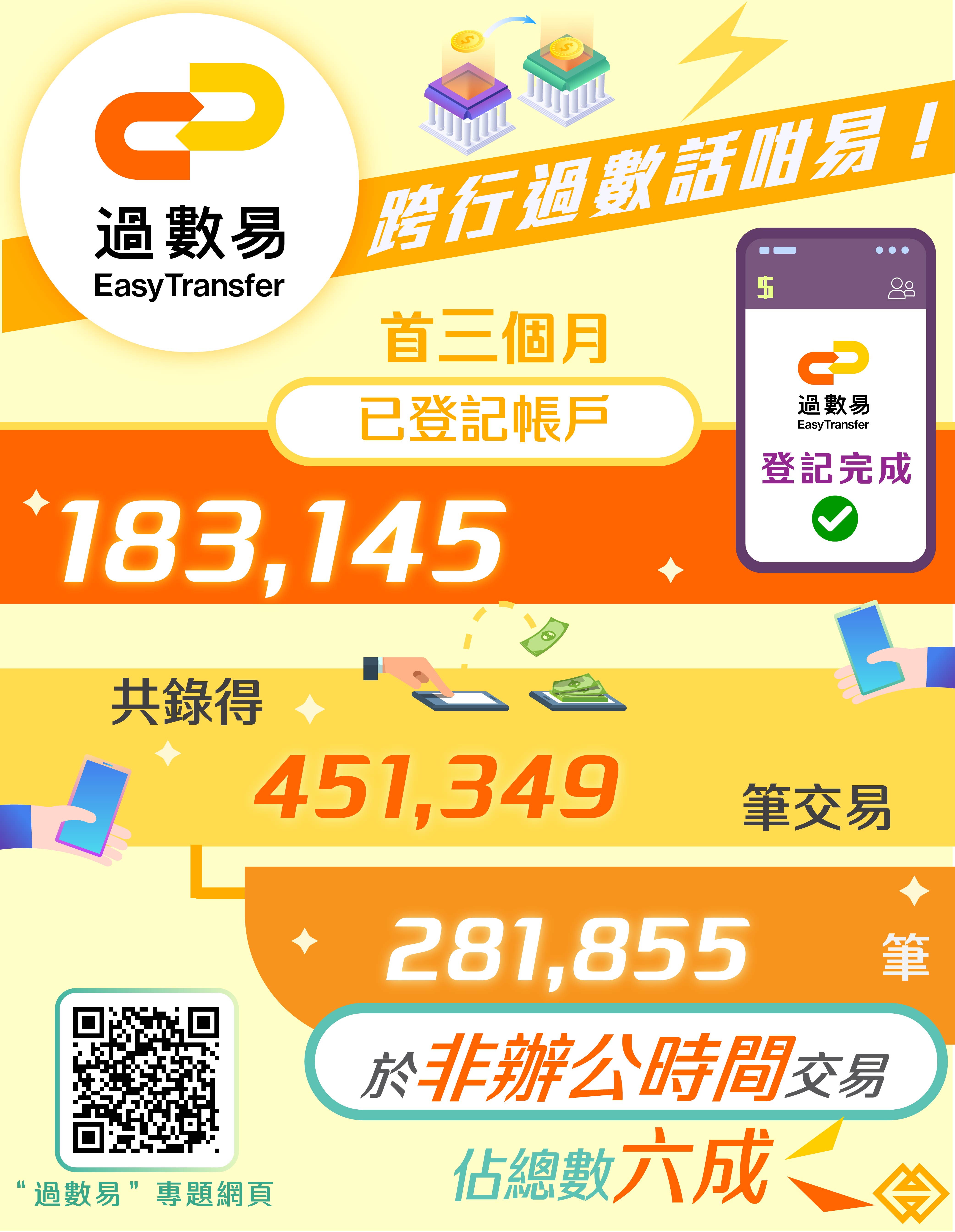 全澳31間銀行參與提供“過數易”快速小額跨行轉帳服務,其中11間銀行更支援7×24全天候運作的即時跨行轉帳服務,轉帳過程可於30秒內完成。“過數易”推出至今三個月,已錄得超過18.3萬帳戶登記,有45.1萬筆交易,當中9千多筆是跨行發薪。總交易筆數中超過六成於非辦公時間進行,達到高效、便捷的服務目標。