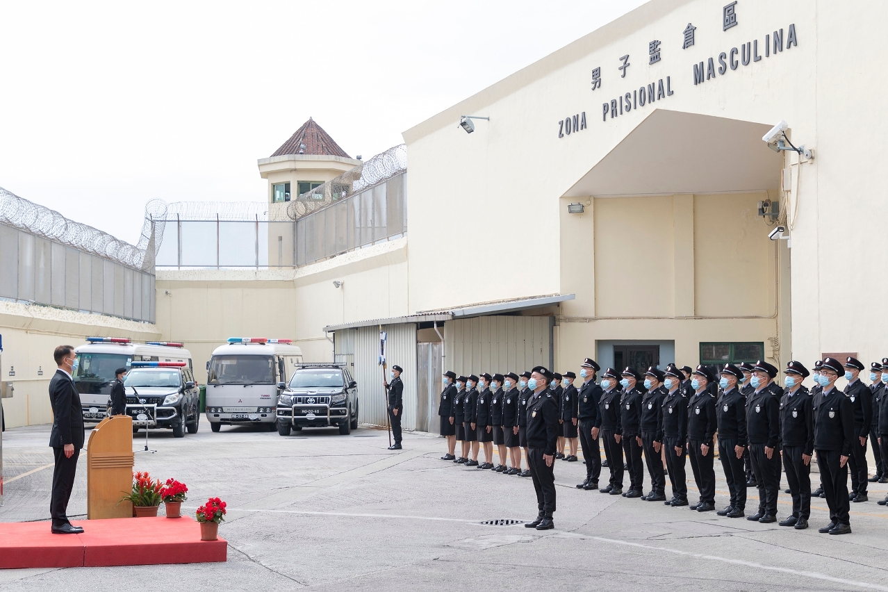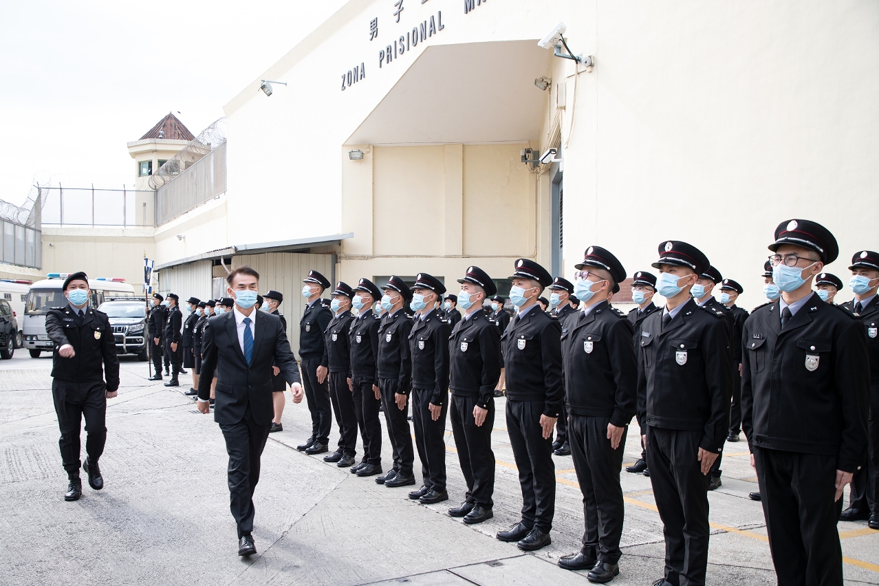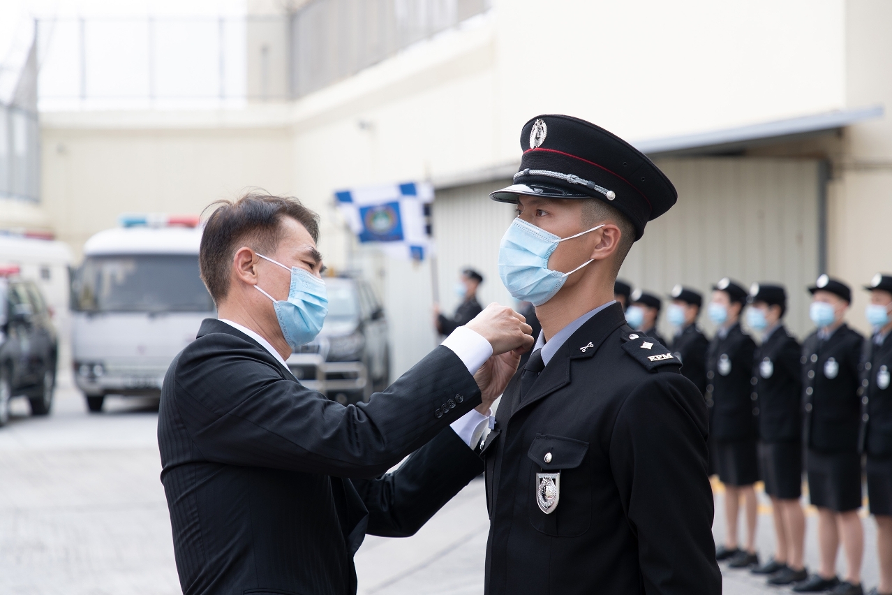 程况明局長致辭時表示,監獄負責執行剝奪自由刑罰和羈押措施,以及協助在囚人重返社會的懲教職責,對維護社會的公平正義及秩序安定有着不可或缺的作用,責任重大。就職的警員在佩戴上獄警肩章的一刻,便肩負起懲教的使命,這是一份光榮而有意義的工作,寄語他們時刻不忘初心、牢記使命,恪盡職守,竭誠履行職責。同時表示,當前內外安全形勢及新冠肺炎疫情複雜多變,懲教工作面臨重大挑戰,工作變得更加艱巨,勉勵全局人員必須堅守信念,不懼困難迎挑戰,遵循“主動警務”、“社區警務”及“公關警務”三個新型警務理念,竭盡所能做好常態化抗疫防疫工作,忠誠履職盡責守護人員和監所的安全,積極協助在囚人重建新生,為澳門特區的長治久安作出應有的貢獻。
