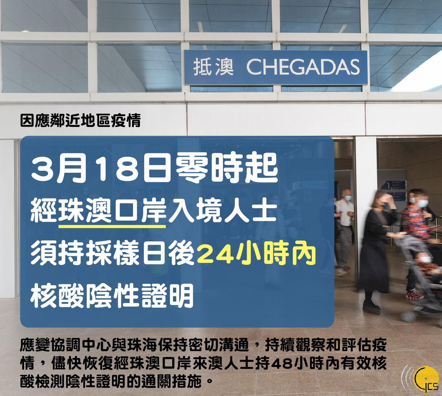 珠澳口岸到澳須持有24小時內核酸檢測陰性結果證明通關
